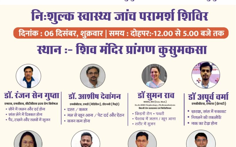 बालोद। कुसुमकसा में 6 दिसम्बर को वृहद स्तर पर स्वास्थ्य शिविर का आयोजन हो रहा है। जिसमें प्रदेश के सभी बड़े डॉक्टर अपनी सेवा देंगे। साथ ही ब्लड ग्रुप भी चेक किया जाएगा और जिनका आयुष्मान कार्ड नहीं बना है उनका इस शिविर में कार्ड भी बनाया जाएगा। समाजसेवी और जनपद सदस्य संजय बैस ने … Continue reading कुसुमकसा में होगा 6 दिसम्बर को वृहद स्तर पर स्वास्थ्य शिविर, प्रदेश के सभी बड़े डॉक्टर देंगे अपनी सेवा,देखिए क्या- क्या मिलेगी सुविधा