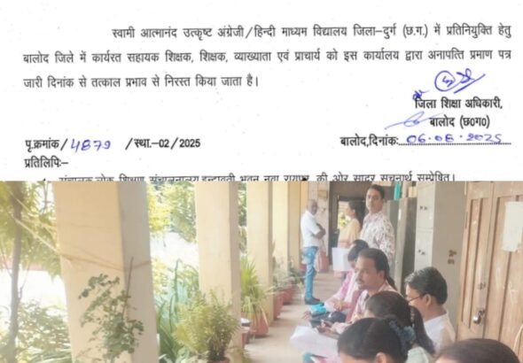 मामला स्वामी आत्मानंद उत्कृष्ट अंग्रेजी माध्यम स्कूल दुर्ग जिले में प्रतिनियुक्ति में पदस्थ होने को लेकर बालोद। बालोद जिले का शिक्षा विभाग एक बार फिर चर्चा में आ गया। ताजा मामला दुर्ग जिले में नवीन संचालित 10 स्वामी आत्मानंद उत्कृष्ट अंग्रेजी माध्यम स्कूलों के लिए प्रतिनियुक्ति शिक्षक नियुक्त करने को लेकर है। इसके लिए दुर्ग … Continue reading प्रतिनियुक्ति के लिए जारी एनओसी को बालोद के प्रभारी डीईओ ने किया निरस्त, शिक्षकों में आक्रोश, कलेक्टर से होगी शिकायत