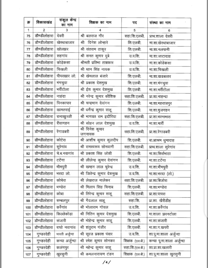 बालोद। शिक्षा विभाग की बड़ी खबर सामने आई है। डी ई ओ कार्यालय द्वारा साला संकुल व्यवस्था अंतर्गत शाला मॉनिटरिंग के सुदृढ़ीकरण को ध्यान में रखते हुए जिले के 173 स्कूलों का पुनर्गठन कर 169 संकुल में प्रधान पाठक, उच्च वर्ग शिक्षक, शिक्षक एलबी, सहायक शिक्षक को आगामी आदेश तक के लिए संकुल समन्वयक का प्रभार सौंपा गया है। इस पर 169 शिक्षकों की लिस्ट जारी की गई है। जिन्हें अलग-अलग संकुल की जिम्मेदारी दी गई है।