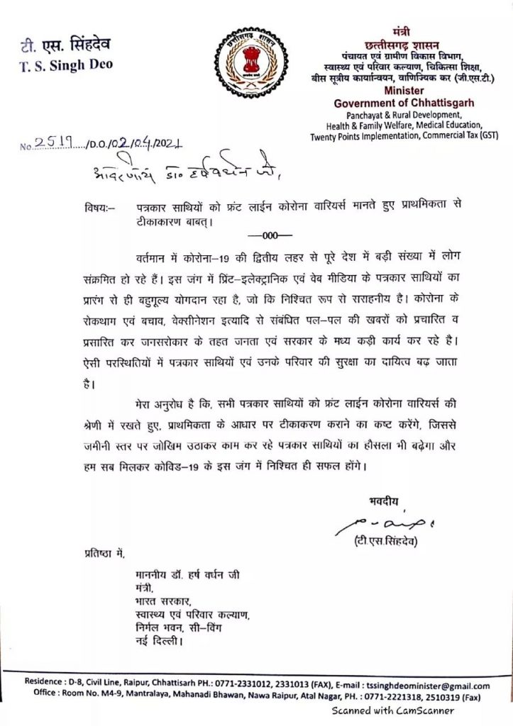 स्वास्थ्य मंत्री टीएस सिंहदेव ने केंद्रीय स्वास्थ्य मंत्री हर्षवर्धन को पत्र लिखकर पत्रकारों को फ्रंट लाइन वारियर्स मानते हुए कोरोना टीकाकरण में प्राथमिकता देने का आग्रह किया है. राज्य के स्वास्थ्य मंत्री द्वारा पत्रकारों के हित में उठाए गए इस कदम की सराहना हो रही है। स्थानीय पत्रकारों ने इस पत्र को लेकर स्वास्थ्य मंत्री की सोच की सराहना की है। शासन प्रशासन से इस पर जल्द अमल किए जाने की मांग भी उठ रही है।