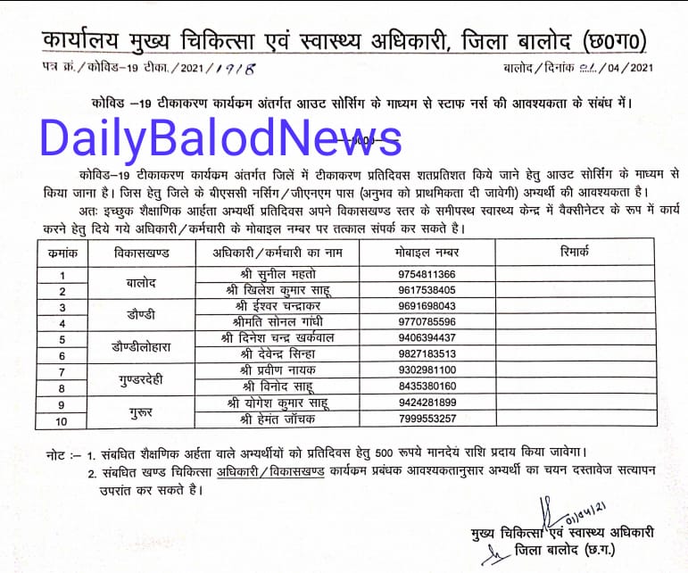 उक्त व्यवस्था अस्थाई है।इच्छुक शैक्षणिक अहर्ता वाले अभ्यर्थी उक्त दिए गए नंबरों पर संपर्क कर सकते हैं। संबंधित अभ्यर्थियों को प्रति दिवस हेतु ₹500 मानदेय राशि दिया जाएगा। कोरोना के टीकाकरण में तेजी लाने के लिए यह व्यवस्था अपनाई जा रही है। ताकि स्वास्थ्य विभाग अपने स्टाफ की कमी को इस जरिए से दूर कर सकें।