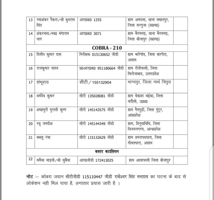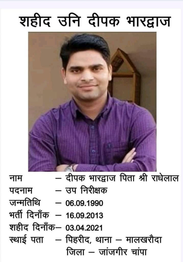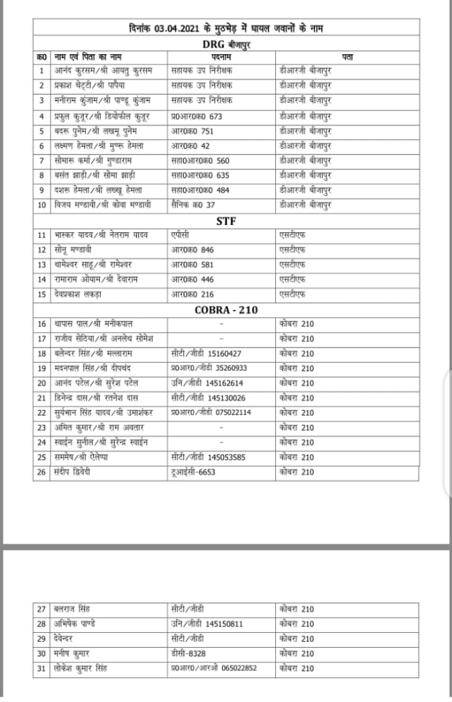 घटना में शहीद बीजापुर के थाना प्रभारी उप निरीक्षक दीपक भरद्वाज की कुछ साल पहले ही शादी हुई थी। अधिकतर जवान बीजापुर जिले से हैं। देखिए पूरी लिस्ट व अन्य जानकारी व तस्वीरें