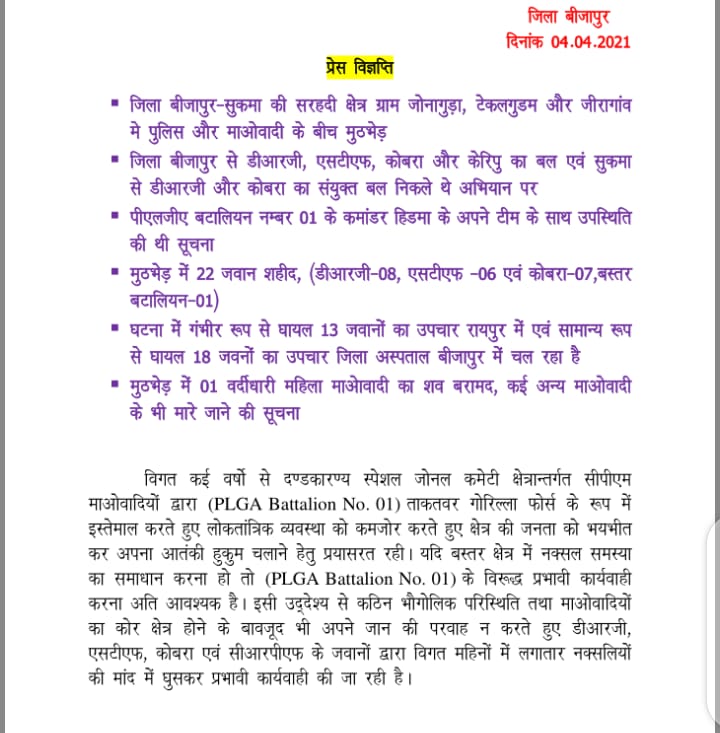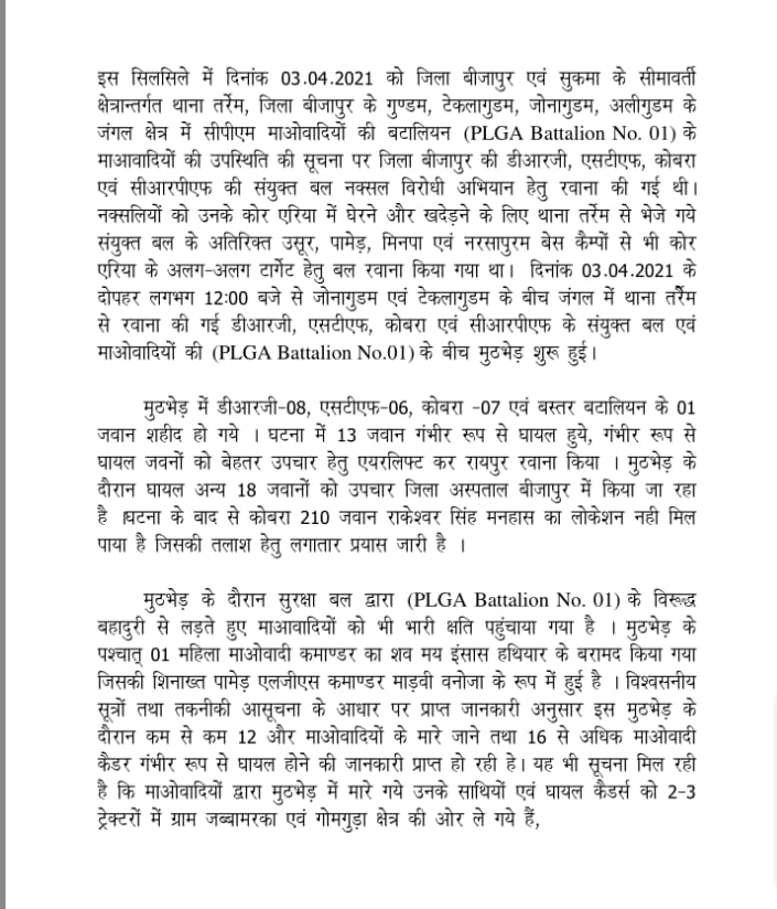 बीजापुर। बीजापुर पुलिस ने कल बीजापुर सुकमा सरहदी क्षेत्र ग्राम जोनागुड़ा, टेकल गुडम, जीरा गांव के बीच नक्सली मुठभेड़ को लेकर प्रेस नोट जारी कर दिया है। जिसमें 22 जवानों की शहादत लिस्ट जारी की गई तो एक कोरबा का जवान राकेश्वर सिंह मन्हास को घटना के बाद से लोकेशन नहीं मिलना बताया गया है। माना जा रहा है कि अब तक 23 शहीद हुए हैं वहीं 31 जवान घायल हैं जिनका इलाज चल रहा है। तो वही घटनास्थल पर एक नक्सली महिला कमांडर माड़वी वनोजा का शव मिला है तो पुलिस सूत्रों से पता चला है कि इस मुठभेड़ के दौरान कम से कम 12 और माओवादी मारे गए तो ही 16 माओवादी भी गंभीर घायल हुए हैं। शहीदों की संख्या औऱ बढ़ सकती है।