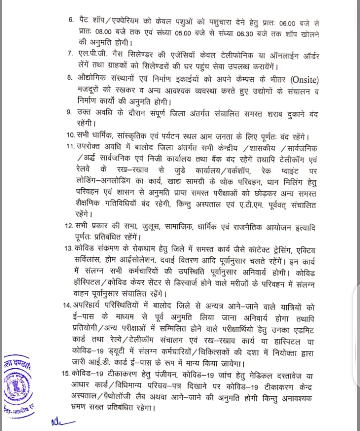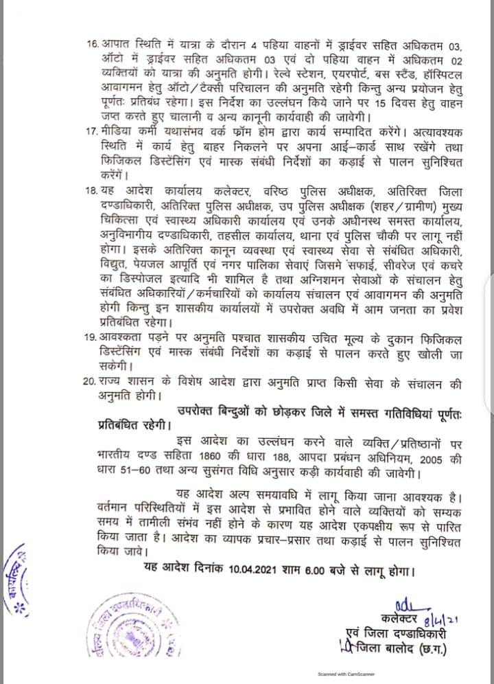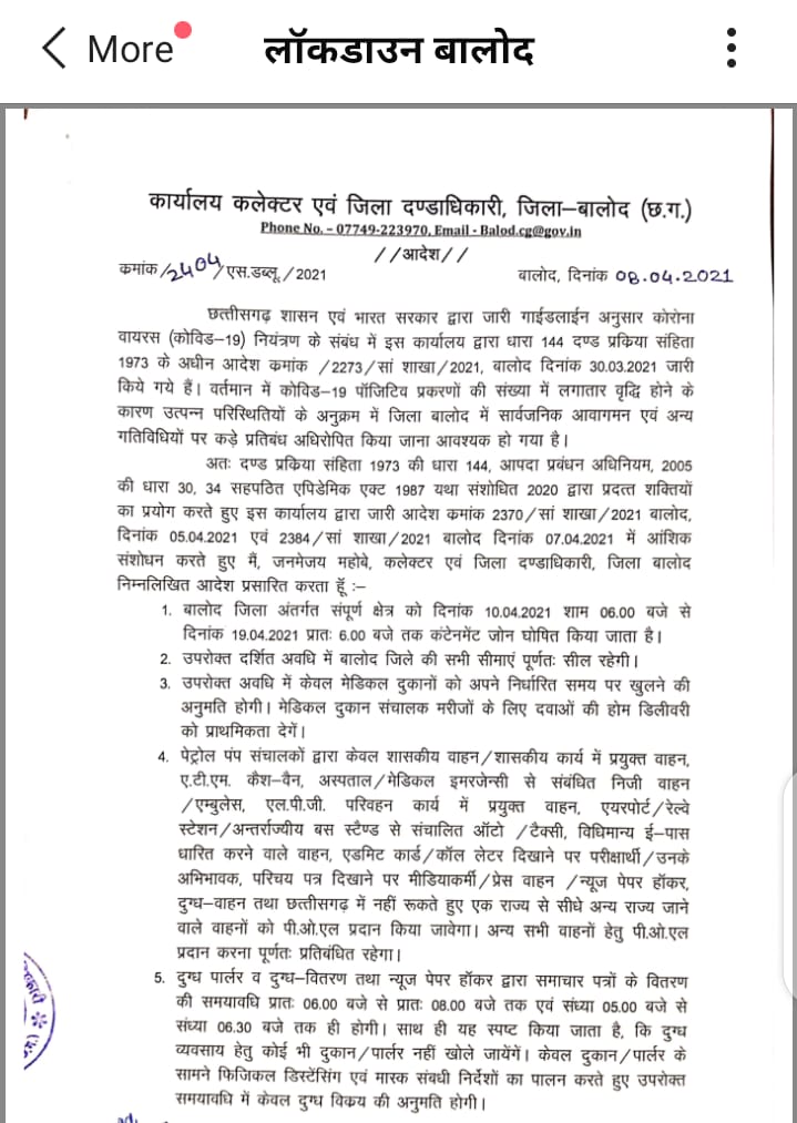 बालोद। अंततः बालोद जिले में बढ़ते कोरोना केस को देखते हुए कलेक्टर जन्मेजय महोबे ने यहां भी लॉकडाउन को लेकर आदेश जारी कर दिया है। लॉक डाउन का उक्त आदेश 10 अप्रैल से लागू होगा। जो 19 अप्रैल तक रहेगा। इस दौरान क्या-क्या चालू रहेंगे क्या-क्या बन्द देखें, विस्तृत जानकारी क्या है आदेश में