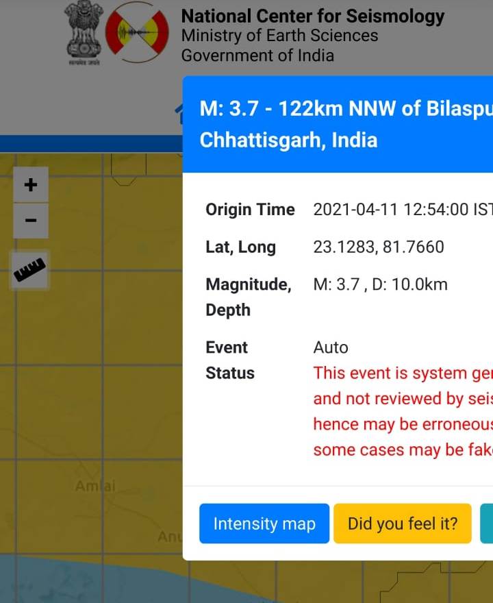 रायपुर / बिलासपुर – छत्तीसगढ़-मध्यप्रदेश की सीमा पर रविवार दोपहर भूकंप के झटके महसूस किए गए। इसका केंद्र बिलासपुर से 139 किलोमीटर उत्तर-पूर्व की ओर बताया जा रहा है। मौसम विभाग ने बताया कि रिक्टर पैमाने पर भूकंप की तीव्रता 3.9 मापी गई है।जानकारी के मुताबिक, दोपहर 12.55 से एक बजे के बीच छत्तीसगढ़ के गौरेला-पेंड्रा-मरवाही, कोरिया और मध्य प्रदेश के अनूपपुर और शहडोल के कुछ हिस्सों में भूकंप के झटके महसूस किए गए। कोरिया जिले के चिरमिरी, मनेन्द्रगढ़ और बैकुंठपुर में भी झटके लगे। महज कुछ सेकंड तक ही धरती हिली, लेकिन लोग दहशत में आ गए। लॉकडाउन के कारण लोग अपने-अपने घरों में ही थे। दोपहर में अचानक दीवारें, पंखे और सामान हिलने लगे। लोगों को समझते देर नहीं लगी, बचने के लिए सब अपने-अपने घरों से बाहर निकल आए। अभी तक किसी नुकसान की खबर नहीं है। पेंड्रा के कुछ घरों में हल्की दरारें आने की बात सामने आ रही है।