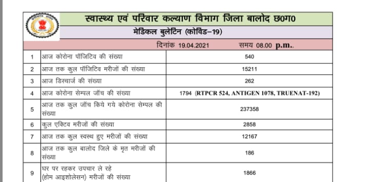 बालोद। बालोद जिले में अब तक कोरोना से 186 लोगों की मौत हो गई है। सोमवार को 540 लोगों की रिपोर्ट पॉजिटिव आई है । बालोद के कोविड अस्पताल में रविवार शाम 7 बजे के बाद से सोमवार शाम 7 बजे तक यानी 24 घंटे में 10 संक्रमितों की मौत की पुष्टि स्वास्थ्य विभाग ने की थी। रायपुर व दल्ली के अस्पताल में 5 संक्रमितों की मौत होने की पुष्टि हुई है। इस तरह 15 संक्रमितों ने दम तोड़ा। यह विभाग के अनुसार ही न्यूनतम आंकड़ा है। आंकड़े बदल सकते है। कोविड अस्पताल में शाम 4 बजे छग शिक्षक महासंघ के जिला मीडिया प्रभारी व कोहंगाटोला संकुल के समन्वयक रेलवे कॉलोनी निवासी विवेक उइके (32) की मौत हो गई।