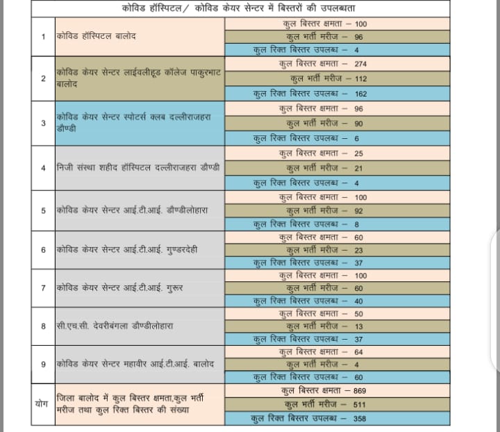कोविड अस्पताल- बालोद के 32 वर्षीय युवक, गुंडरदेही के 45, 47 व 65 वर्षीय पुरुष संक्रमित, मरकाटोला गुरुर के 60 वर्षीय, सिवनी की 60 वर्षीय महिला, दल्ली की महिला की मौत हुई।
