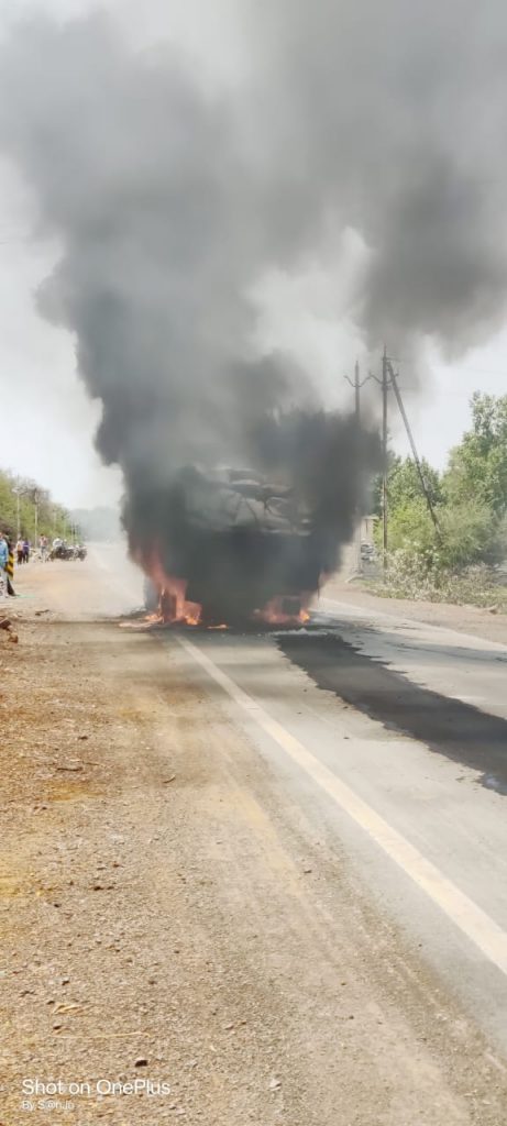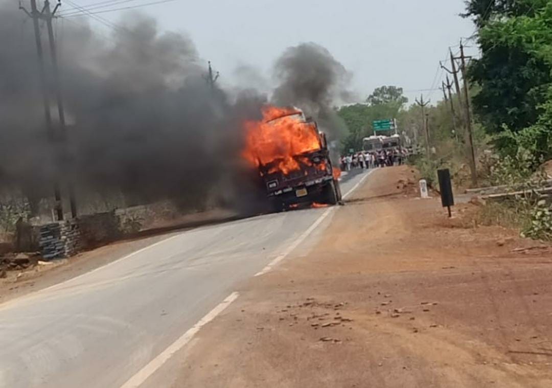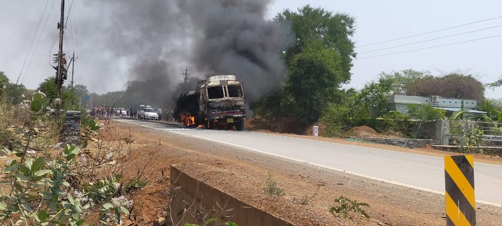 इस बीच ट्रक का एक टायर अचानक फटा और इस जोर की वजह से ट्रक का डीजल टंकी फूट गया और देखते-देखते आग लग गई। डीजल बाहर गिरने लगा लगभग 100 मीटर तक ट्रक फटे टायर के साथ घिसटती रही और फिर देखते देखते आग ने जोर पकड़ लिया। आसपास मौजूद पत्थर खदानों के टैंकर व सिंघानिया कंपनी के टैंकर से पानी लाकर आग बुझाने की कोशिश की गई। फायर ब्रिगेड बाद में पहुंची।