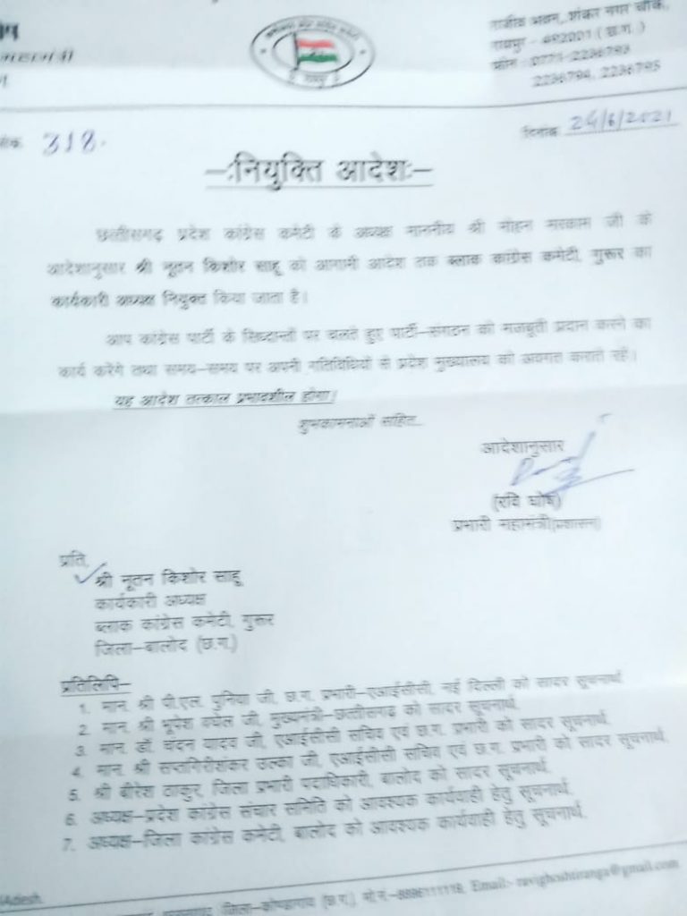 बालोद/गुरुर। गुरुर ब्लॉक कांग्रेस कमेटी के हाल ही के अध्यक्ष डॉ ओमकार महमल्ला द्वारा इस्तीफा दिए जाने के बाद से इस रिक्त पद पर अब ग्राम सोनई डोंगरी के रहने वाले नूतन किशोर साहू को ब्लॉक अध्यक्ष नियुक्त किया गया है। इस संबंध में प्रदेश कांग्रेस कमेटी की ओर से नियुक्ति पत्र भी जारी हो गया है। जिसमें प्रदेश कांग्रेस कमेटी के अध्यक्ष मोहन मरकाम के आदेश अनुसार नूतन किशोर साहू को आगामी आदेश तक ब्लॉक कांग्रेस कमेटी गुरुर का कार्यकारी अध्यक्ष नियुक्त किया गया है। बता दें कि नूतन किशोर पूर्व प्रवक्ता ब्लॉक कांग्रेस कमेटी गुरुर के साथ वरिष्ठ कांग्रेस कार्यकर्ता भी हैं। इस नियुक्ति पर जिला प्रभारी बीरेश ठाकुर, जिला अध्यक्ष चन्द्रप्रभा सुधाकर, विधायक संगीता सिन्हा , केसरी चन्द्राकर ,परस कोसरिया सत्येंद्र साहू, बसन्त साहू,हरिशपुरी गोस्वामी, मीना साहू, ललिता साहू, केदार देवांगन, प्रभात ध्रुवे जनपद अध्यक्ष, नगर पंचायत अध्यक्ष डिकेश्वरी साहू, तुकाराम साहू प्रदेश सचिव, ताम्रजध्वज यादव सहित अन्य लोगों ने हर्ष जताया। ज्ञात हो कि ओंकार महमल्ला पर दुष्कर्म व एसटी एससी एक्ट का मामला दर्ज होने के कारण उन्होंने स्वेच्छा से प्रदेश अध्यक्ष को अपना अध्यक्ष पद से इस्तीफा सौंपा था। जिन्होंने बाद में फिर खुद थाने जाकर सरेंडर किया और जमानत पर रिहा हुए हैं।