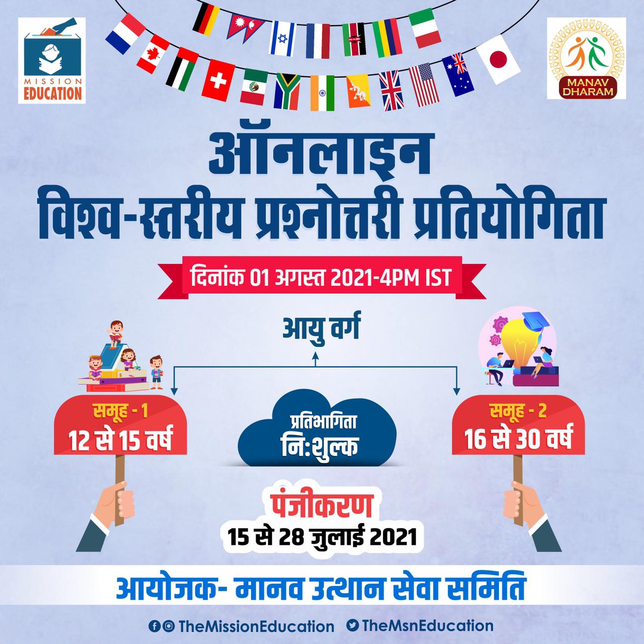 रायपुर/बालोद/नई दिल्ली। मानव उत्थान सेवा समिति (पंजी०) के नेतृत्व में मिशन एजुकेशन द्वारा ऑनलाइन विश्व-स्तरीय प्रश्नोत्तरी प्रतियोगिता का आयोजन 1 अगस्त 2021 को किया जा रहा है जिसके परिणाम की सूचना 8 अगस्त 2021 रविवार को लाइव प्रसारण द्वारा दी जाएगी।