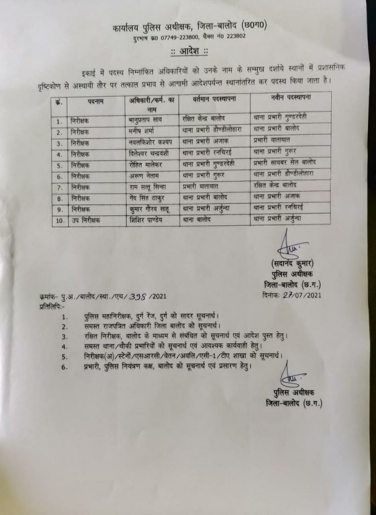 One thought on “ब्रेकिंग न्यूज़- बालोद जिले में पुलिस विभाग में बड़ा फेरबदल, बदले गए कई थाना प्रभारी, देखें, कौन किधर गए”