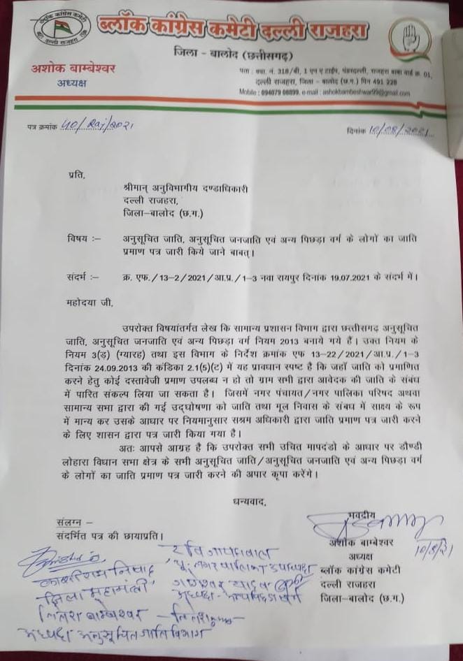 दल्लीराजहरा। ब्लॉक अध्यक्ष अशोक बाम्बेश्वर के नेतृत्व में कांग्रेस के पदाधिकारियों ने आज अनुविभागीय अधिकारी श्रीमती प्रेमलता चंदेल को नगर में विभिन्न समस्या को लेकर ज्ञापन पत्र सौंपा। सर्वप्रथम मांग अनुसूचित जाति, जनजाति, अन्य पिछड़ा वर्ग के कुछ लोगों प्रमाणपत्र बनाने में दिक्कतों का सामना करना पड़ रहा है