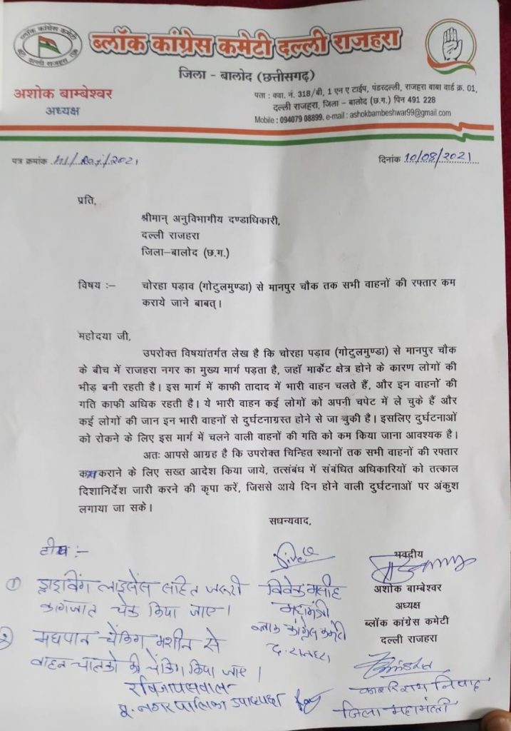 उसको ध्यान रखते हुए मांग पत्र सौंपा।द्वितीय मांग मानपुर चौक से गोटुलमुंडा (चोरहापड़ाव) तक भारी वाहनों का रफ्तार धीमी करने, वाहनों के जरूरी कागजात चेक करने तथा शराब पीकर गाड़ी चलाने वालों का वाहन चालक का चेकिंग किट से चेक किया जाये, नो एंट्री को कड़ाई से पालन किया जाए, टाऊनशिप में भारी वाहनों का प्रवेश निषेध किया जाए।