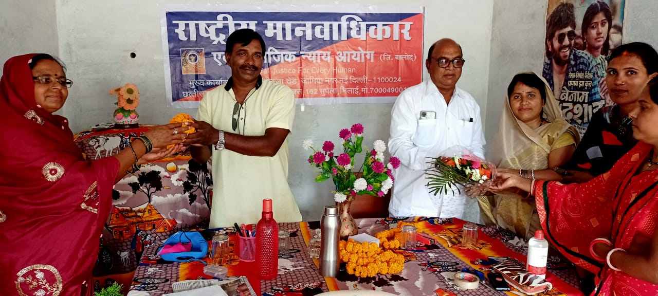 बालोद।राष्ट्रीय मानवाधिकार व सामाजिक न्याय आयोग बालोद जिले के पदाधिकारियों की मासिक बैठक ग्राम रानीतराई रोड ब्लॉक लोहारा में हुई। सर्वप्रथम प्रदेश अध्यक्ष श्यामलाल साहू का पुष्प गुच्छ भेंट कर स्वागत किया गया। कार्यक्रम का शुभारंभ नए व वरिष्ठ सदस्यों के परिचय के साथ हुआ। तत्पश्चात आयोग के कार्य व महिला सशक्तिकरण के संदर्भ में सभी ने अपने विचार रखे। साथ ही संविधान द्वारा प्रदत्त मानवाधिकारों का सामाजिक पृष्ठभूमि में सफल क्रियान्वयन व संवर्धन हेतु कृत्संकलपित होकर प्रतिज्ञा की गई।