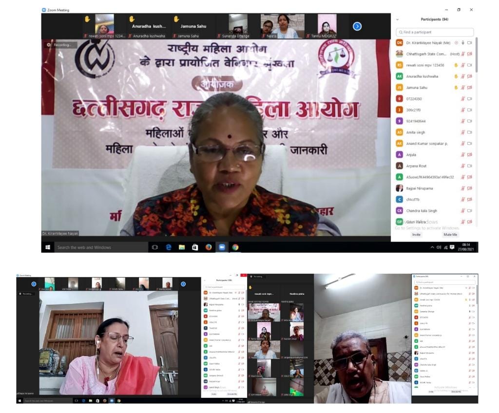 राष्ट्रीय महिला आयोग द्वारा प्रायोजित वेबिनार श्रृंखला के तहत छत्तीसगढ़ राज्य महिला आयोग द्वारा आयोजित वेबिनार में आज अम्बिकापुर क्षेत्र की महिलाओं ने भाग लिया। आयोग की अध्यक्ष डॉ. किरणमयी नायक के अगुवाई में आयोजित वेबिनार का विषय ‘‘महिलाओं के सोशल मीडिया प्लेटफॉर्म पर दुर्व्यवहार एवं साइबर क्राइम‘‘ था। कार्यक्रम में अधिवक्ता उच्च न्यायालय की श्रीमती निरूपमा वाजपेयी और फॉरेंसिक एक्सपर्ट डॉ. सुनंदा ढेंगे ने भी अपने विचार रखे। इस दौरान महिलाओं के प्रश्नों और जिज्ञासाओं के जवाब भी वक्ताओं ने दिए और सोशल मिडिया प्लेटफॉर्म संबंधी सभी शंकाओं का समाधान किया।