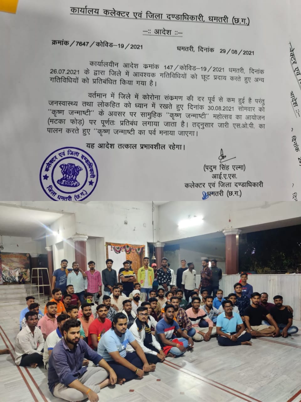 दादु सिन्हा धमतरी। जन्माष्टमी को लेकर पूरी तैयारी हो जाने के बाद एन वक्त में जिला प्रशासन द्वारा आदेश जारी कर आयोजन पर पाबंदी लगाए जाने से श्री राम हिंदू संगठन ने नाराजगी जाहिर की है और वे अपने निर्णय पर अड़े हुए जन्माष्टमी आयोजन करने का फैसला ले चुके हैं। धमतरी में जिला प्रशासन और श्री राम हिंदू संगठन आमने-सामने आ गए हैं। हिंदू संगठन के लोगों का कहना है कि हम आदेश नहीं मानेंगे। तैयारी हो गई है और हम जन्माष्टमी भी पूरे उत्साह के साथ मनाएंगे। कलेक्टर पीएस एल्मा ने 29 अगस्त की शाम एक बड़ा आदेश जारी किया है। आदेश में कहा गया है कि कोरोना संक्रमण की दर पूर्व से कम हुई है परंतु जन स्वास्थ्य तथा लोक हित को ध्यान में रखते हुए 30 अगस्त सोमवार को कृष्ण जन्माष्टमी के अवसर पर सामूहिक महोत्सव का आयोजन मटका फोड़ पर पूर्णतः प्रतिबंध लगाया जाता है तदनुसार जारी एसओपी का पालन करते हुए कृष्ण जन्माष्टमी का पर्व मनाया जाएगा। यह आदेश तत्काल प्रभाव से माना गया है। कलेक्टर के इस आदेश से हड़कंप मच गया है।