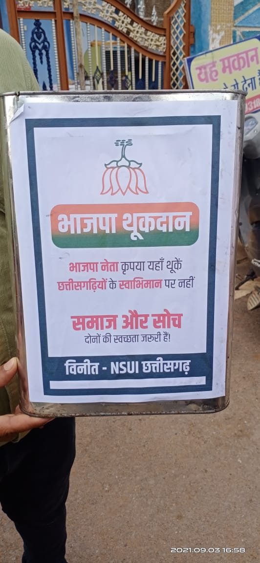 बालोद। छत्तीसगढ़ प्रदेश NSUI अध्यक्ष आकाश शर्मा एवं NSUI छत्तीसगढ़ प्रदेश प्रभारी विशाल चौधरी के निर्देशानुसार छत्तीसगढ़ भाजपा प्रभारी डी. पुरंदेश्वरी के विवादित बयान के विरोध में शुक्रवार को बालोद NSUI द्वारा भाजपा कार्यालय सहित अन्य कई सार्वजनिक जगहों पर “भाजपा थूकदान” रखा और कहा कि “भाजपा नेता कृपया यहाँ थूके। छत्तीसगढ़ियों के स्वाभिमान पर नही समाज और सोच दोनों की स्वच्छता जरूरी है।