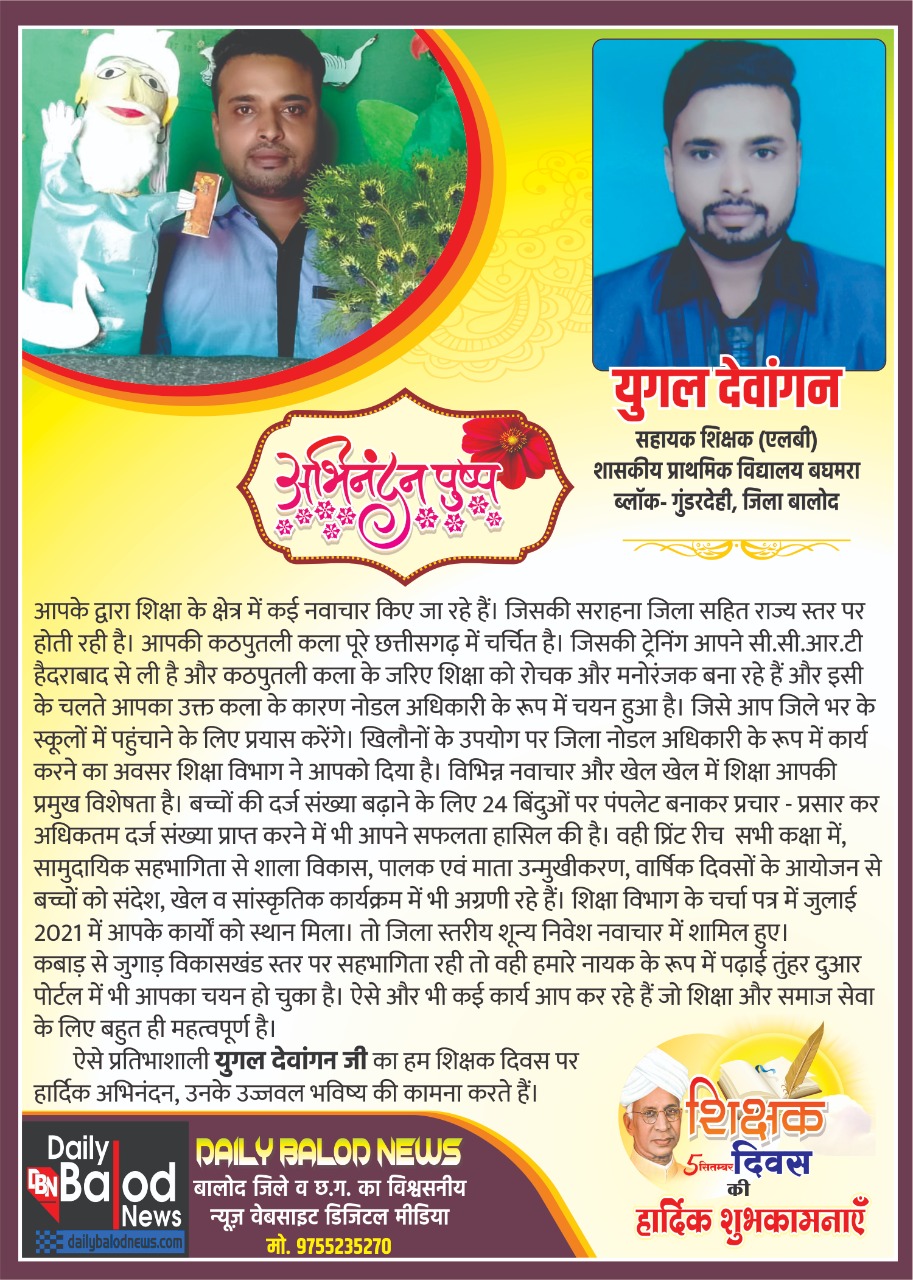 बालोद – युगल देवांगन,सहायक शिक्षक (एलबी) शासकीय प्राथमिक विद्यालय बघमरा, ब्लॉक- गुंडरदेही, जिला बालोद जिन्हें शिक्षा के क्षेत्र में कठपुतली का कलाकार कहना उचित होगा जो कठपुतली कला से जाने जाते हैं. उनके द्वारा शिक्षा के क्षेत्र में कई नवाचार किए जा रहे हैं। जिसकी सराहना जिला सहित राज्य स्तर पर होती रही है। उनक कठपुतली कला पूरे छत्तीसगढ़ में चर्चित है। जिसकी ट्रेनिंग उन्होंने सीसीआरटी हैदराबाद से ली है और कठपुतली कला के जरिए शिक्षा को रोचक और मनोरंजक बना रहे हैं और इसी के चलते उक्त कला के कारण नोडल अधिकारी के रूप में चयन हुआ है। जिसे उन्हें जिले भर के स्कूलों में पहुंचाने के लिए प्रयास करना है। खिलौनों के उपयोग पर जिला नोडल अधिकारी के रूप में कार्य करने का अवसर शिक्षा विभाग ने उन्हें दिया है। विभिन्न नवाचार और खेल-खेल में शिक्षा उनकी प्रमुख विशेषता है