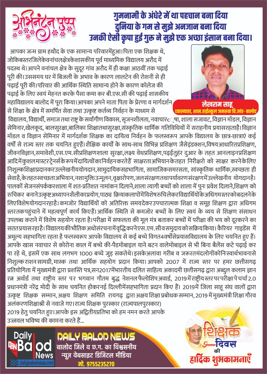 बालोद – लेख राम साहू व्याख्याता, शासकीय हाईस्कूल जमरूवा विकास खंड बालोद, जिला बालोद जिन्हें प्रधान मंत्री नरेंद्र मोदी द्वारा जब पहली बार परीक्षा पर चर्चा कार्यक्रम हुआ तो सहभागी बने और वहां से प्रेरित होकर बच्चों को भी परीक्षा के भी से बचने मंत्र( ट्रिक) बताते हैं. इनकी कहानी भी संघर्षों से भरी है. उनका जन्म ग्राम हथौद के एक सामान्य परिवार में हुआ। पिता एक शिक्षक थे, जो कि बस्तर जिले के वनांचल क्षेत्र के शासकीय पूर्व माध्यमिक विद्यालय अरौद में पदस्थ थे। वनांचल क्षेत्र के सुदूर गांव अरौद में ही कक्षा आठवीं तक पढ़ाई पूरी की। उस समय घर में बिजली के अभाव के कारण लालटेन की रोशनी से ही पढ़ाई करते थे। परिवार की आर्थिक स्थिति सामान्य होने के कारण कॉलेज की पढ़ाई के लिए स्वयं मेहनत करके पैसा कमा कर बी. एस. सी की पढ़ाई शासकीय महाविद्यालय बालोद में पूरा किए। अपने माता पिता के प्रेरणा व मार्गदर्शन से शिक्षा के क्षेत्र में समर्पित सेवा तथा उत्कृष्ट कर्तव्य निर्वहन के माध्यम से विद्यालय, विद्यार्थी, समाज तथा राष्ट्र के सर्वांगीण विकास, सृजनशीलता, नवाचारी शिक्षा, शाला सजावट, विज्ञान मॉडल, विज्ञान सेमिनार, खेलकूद, बाल सुरक्षा, बालिका शिक्षा तथा सुरक्षा, संस्कृतिक धार्मिक गतिविधियों में सराहनीय प्रयास रहता है। विज्ञान मॉडल व विज्ञान सेमिनार में मार्गदर्शक शिक्षक का दायित्व निर्वहन के फलस्वरूप उनके विद्यालय के छात्र-छात्राएं कई वर्षों से राज्य स्तर तक चयनित हुए हैं।