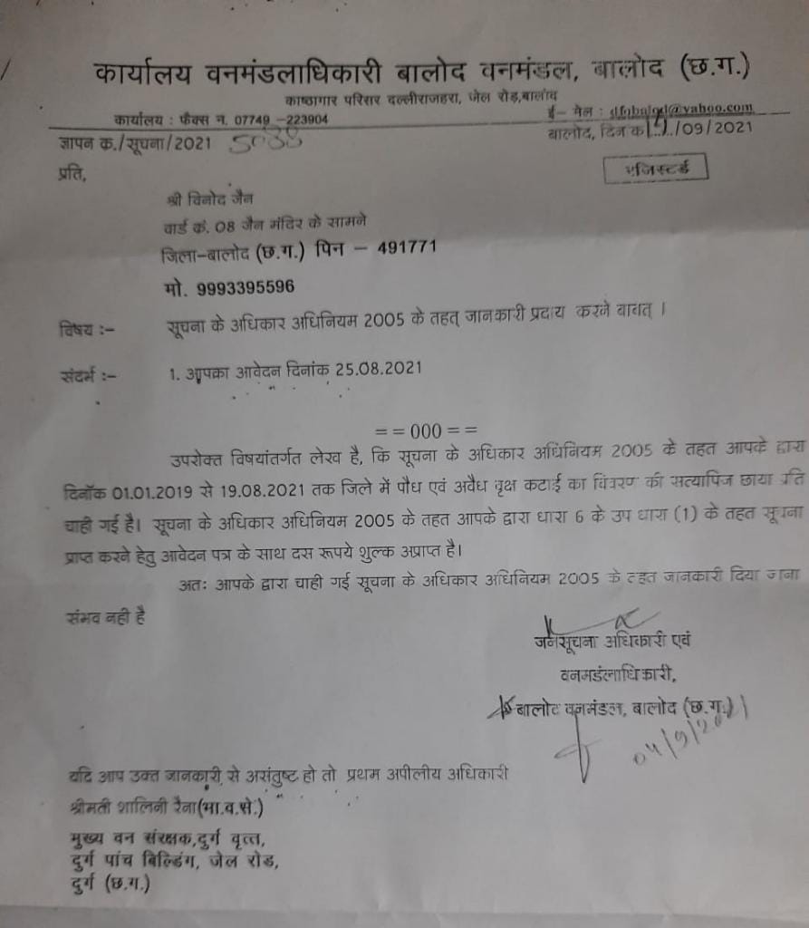 बालोद । सूचना का अधिकार अधिनियम 2005 में जानकारी देने की बजाय नए नए हवाला देकर आवेदक को घुमाये जाने का एक मामला सामने आया है। मामला जिला कार्यालय वनमंडलाधिकारी बालोद वन मण्डल का है। जहां भारतीय जनता पार्टी के आरटीआई प्रकोष्ठ के जिला संयोजक विनोद जैन द्वारा सूचना के अधिकार अधिनियम 2005 की धारा 6 के उपधारा (1) के तहत जानकारी प्रदान करने दिनांक 25 अगस्त 2021 को एक आवेदन विभाग में लगाया था।