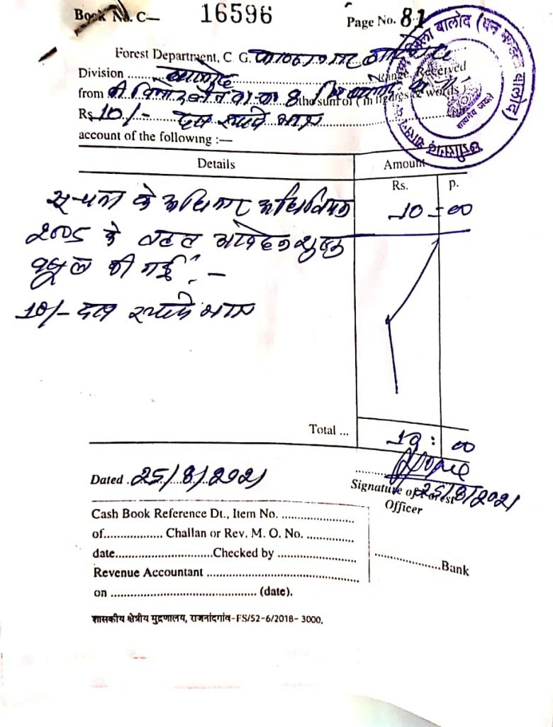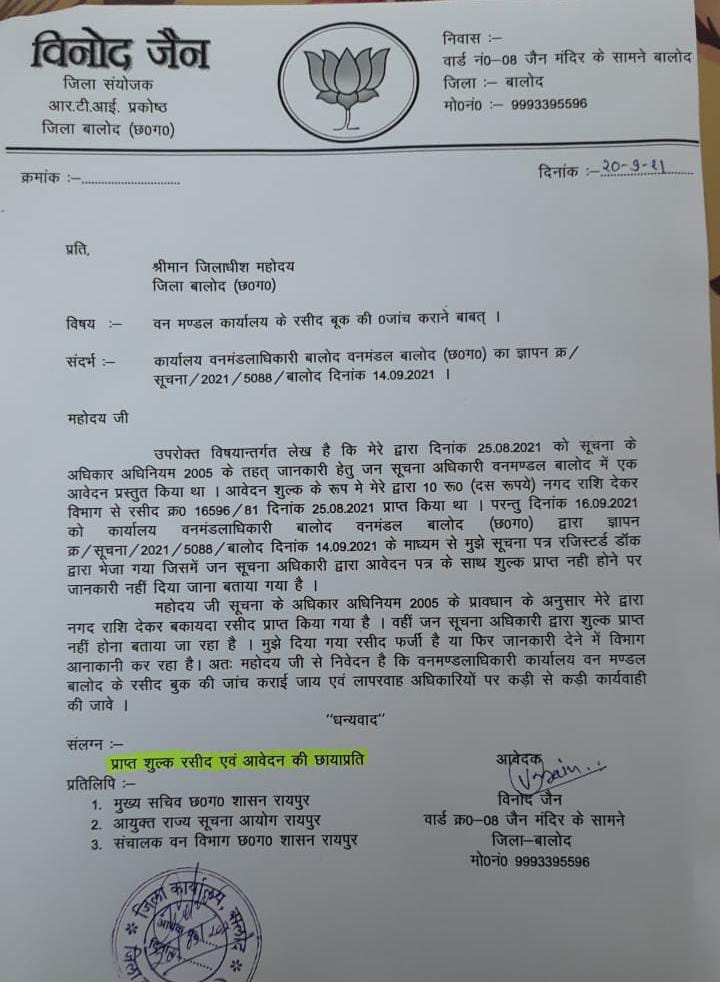 जहां से आवेदन के एवज में आवेदन शुल्क दस रुपये नगद राशि लेकर विभागीय कर्मचारी ने बकायदा रशीद भी दी और आवेदन स्वीकार किया। तत्त्पश्चात विभाग द्वारा दिनांक 14 सितम्बर 2021 को ज्ञापन क्रमांक/सूचना/2021/5088 के माध्यम से सूचना पत्र भेजा गया। जिसमें आवेदन के साथ राशि प्राप्त नही होने के कारण जानकारी देना संभव नही होना बताया गया है। इस विषय पर भाजपा आरटीआई प्रकोष्ठ के जिला संयोजक विनोद जैन ने इसे विभागीय लापरवाही मानते हुए एक ज्ञापन बालोद कलेक्टर को दिया।