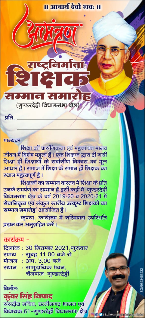 गुंडरदेही।छ ग शासन के संसदीय सचिव एवं गुंडरदेही के लोकप्रिय विधायक कुंवरसिंह निषाद द्वारा 30 सितंबर गुरुवार को सुबह 11 बजे से सामुदायिक भवन चैनगंज में शिक्षक सम्मान समारोह का आयोजन किया गया है। जिसमें ब्लाक कांग्रेस कमेटी गुंडरदेही के समस्त पदाधिकारी,समस्त जोन/सेक्टर/विभाग एवं प्रकोष्ठ के पदाधिकारी,नगरीय निकाय के पार्षद एवं एल्डरमैन, त्रिस्तरीय पंचायती राज के समस्त निर्वाचित जनप्रतिनिधियों, वरिष्ठ कांग्रेसजनों से शामिल होकर कार्यक्रम को सफल बनाने की अपील भोजराज साहू अध्यक्ष, ब्लाक कांग्रेस कमेटी गुंडरदेही ने की है।