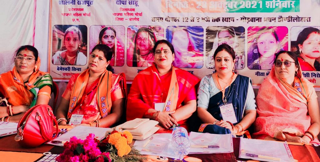 बालोद। भारतीय जनता पार्टी महिला मोर्चा प्रदेशाध्यक्ष शालनी राजपूत, जिलाध्यक्ष दीपा साहू के निर्देशानुसार भाजपा महिला मोर्चा मंडल डौण्डी लोहारा की प्रथम कार्यसमिति बैठक हुई। जहां बैठक के साथ देश में 100 करोड़ वैक्सीनेशन पर लोहारा के स्वास्थ्य कर्मियों को अस्पताल पहुंचकर सम्मानित भी किया गया। महिला मोर्चा प्रदेशाध्यक्ष श्रीमती शालनी राजपूत की मुख्य आतिथ्य में, महिला मोर्चा की जिला अध्यक्ष दीपा साहू, प्रदेश उपाध्यक्ष शीतल नायक के विशेष आतिथ्य तथा मंडल अध्यक्ष पायल सोनी के अध्यक्षता में उक्त बैठक आहूत की गई।