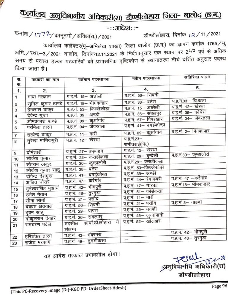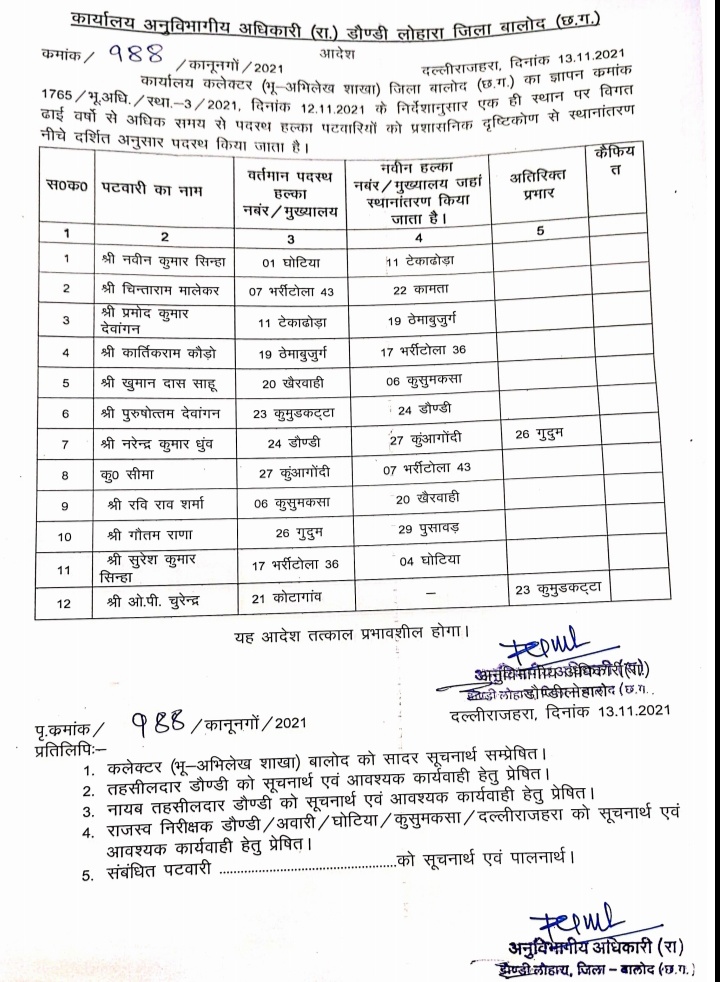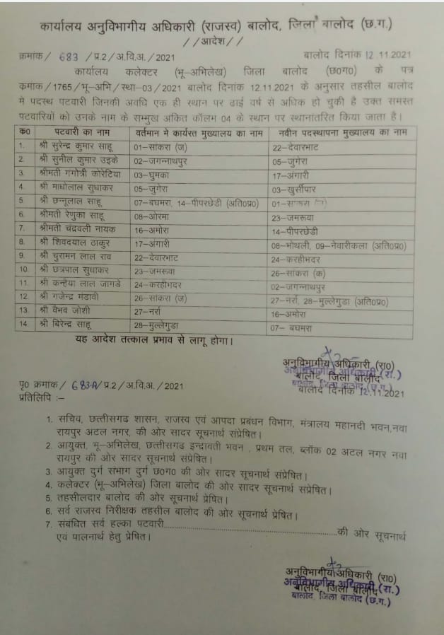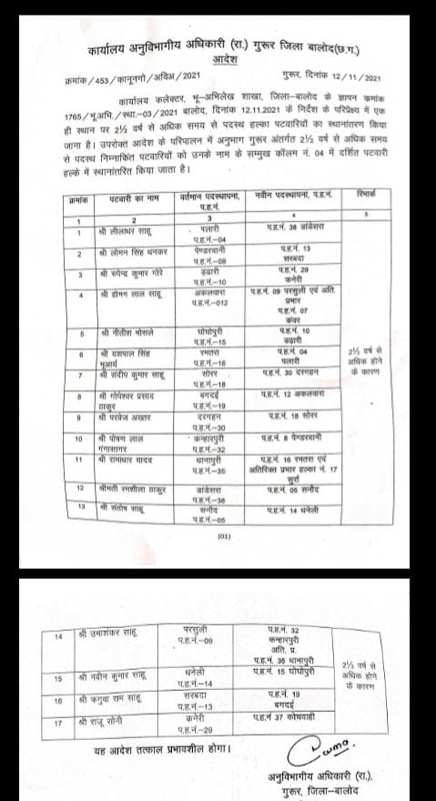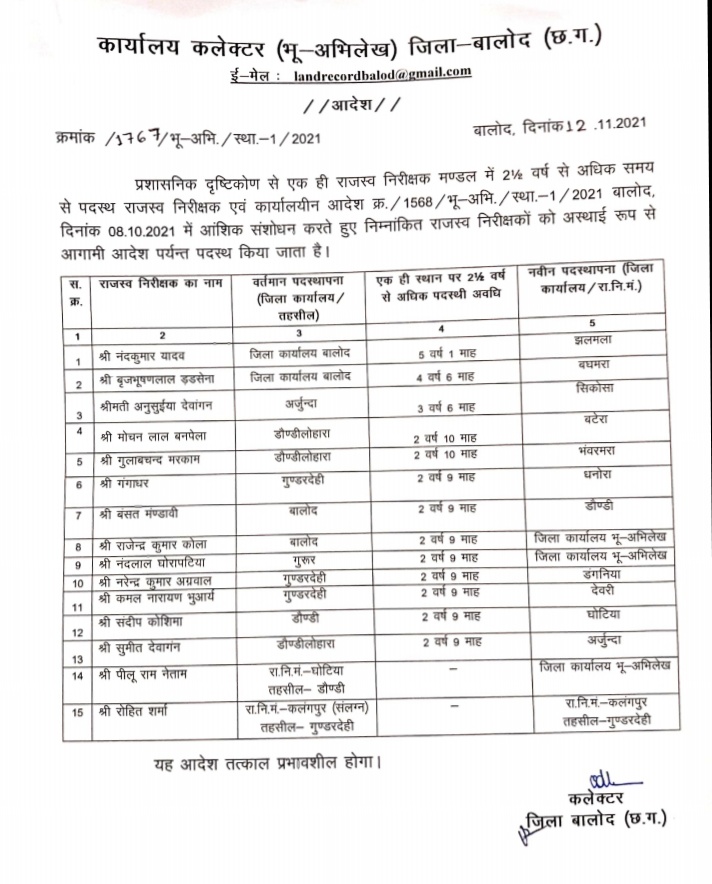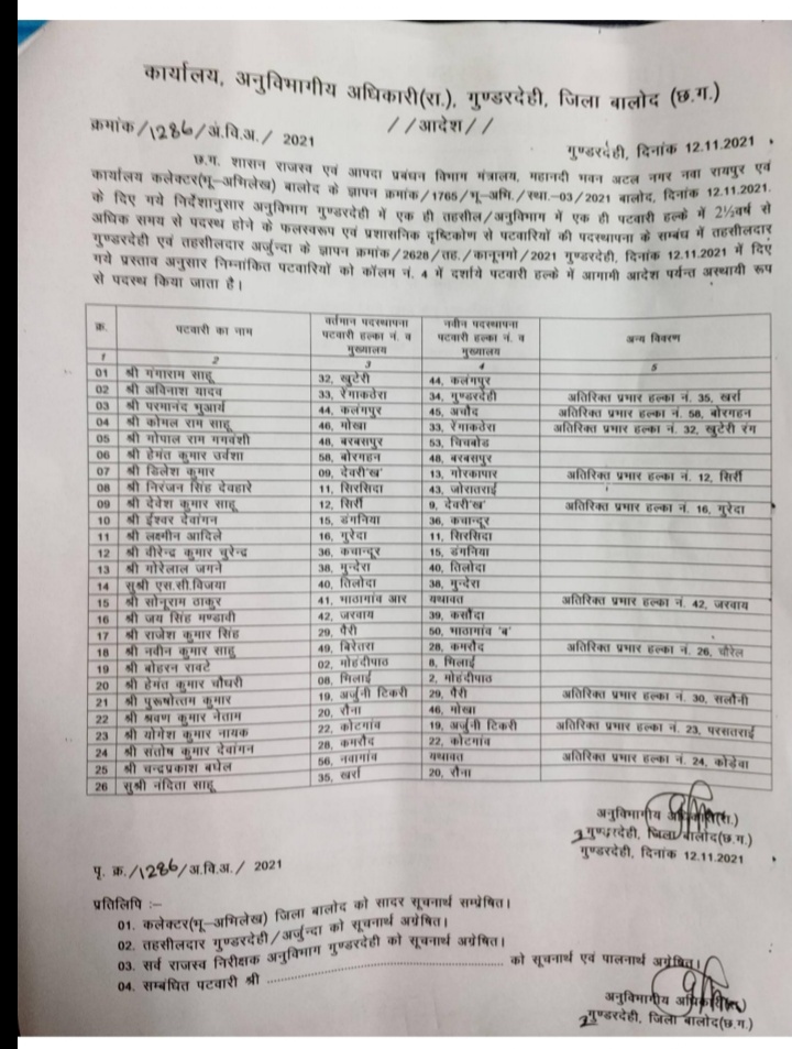 कलेक्टर जनमेजय महोबे ने बताया कि शासन के निर्देश के परिपालन में एक ही स्थान पर ढाई वर्ष से अधिक समय तक पदस्थ 15 राजस्व निरीक्षकों का स्थानांतरण अन्य राजस्व निरीक्षक मण्डल में किया गया है। इसी प्रकार अनुविभाग स्तर से 94 पटवारियों का स्थानांतरण अन्य पटवारी हल्कों में किया गया है। उन्होंने बताया कि एक ही स्थान पर ढाई वर्ष से अधिक समय तक पदस्थ बालोद अनुविभाग के 14 पटवारी, गुरूर अनुविभाग के 17 पटवारी, गुण्डरदेही अनुविभाग के 28 पटवारी और डौण्डीलोहारा अनुविभाग के 35 पटवारियों का स्थानांतरण किया गया है।