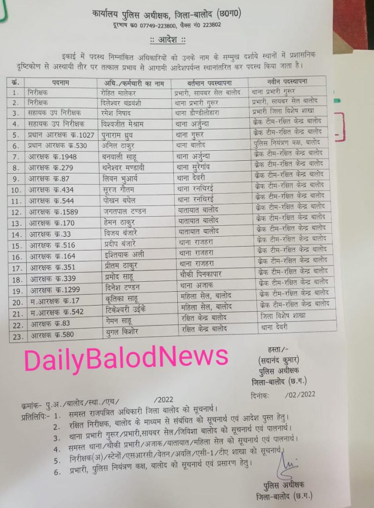 बालोद । बालोद जिला पुलिस प्रशासन में एक बार फिर तबादला का दौर शुरू हुआ है। जिसके तहत दो निरीक्षक, दो सहायक उपनिरीक्षक, दो प्रधान आरक्षक व 17 आरक्षकों का तबादला हुआ है। इस तबादला आदेश में मुख्य रूप से दो निरीक्षक का तबादला प्रमुख माना जा रहा है। जिसके तहत साइबर सेल के प्रभारी रहे रोहित मालेकर को अब थाना प्रभारी गुरुर की जिम्मेदारी दी गई है। तो वही गुरुर में थाना प्रभारी रहे दिलेश्वर चंद्रवंशी को साइबर सेल का जिम्मा सौंपा गया है। बाकी अलग-अलग थानों में पदस्थ प्रधान आरक्षक व आरक्षकों को क्रेक टीम रक्षित केंद्र बालोद में पदस्थ किए गए हैं। कुछ को जिला विशेष शाखा और 1 को थाना देवरी में पदस्थ किया गया है। गुरुर ब्लॉक में लगातार सटोरियों पर भी कार्रवाई चल रही थी। जिसके बाद अचानक थाना प्रभारी दिलेश्वर का तबादला किया जाना भी जिले में चर्चा का विषय बना हुआ है। हालांकि अधिकारी इसे प्रशासनिक दृष्टिकोण से अस्थाई तौर पर स्थानांतरण बता रहे हैं।
