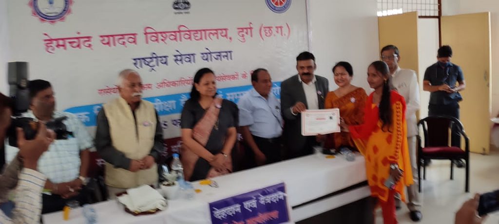 डौंडीलोहारा। शासकीय एकलव्य महाविद्यालय डौंडीलोहारा के राष्ट्रीय सेवा योजना के स्वयंसेविका को हेमचंद विश्वविद्यालय दुर्ग के द्वारा साहसिक कार्य एवं गणतंत्र परेड शिविर में भाग लेने के लिए सम्मानित एवं पुरस्कृत किए। हिस्सा लेने के लिए ,चिकलेश्वरी आमदो को पूर्व गणतंत्र दिवस परेड शिविर आगरा उत्तर प्रदेश में हिस्सा लेने के लिए, सम्मानित किया गया। महाविद्यालय के कार्यक्रम अधिकारी एवं स्वयंसेवकों ने हेमचंद यादव विश्वविद्यालय दुर्ग के कुलपति डॉ अरुणा पलटा एवं समन्वयक डॉक्टर आरपी अग्रवाल के हाथों सम्मानित एवं पुरस्कृत हुए।