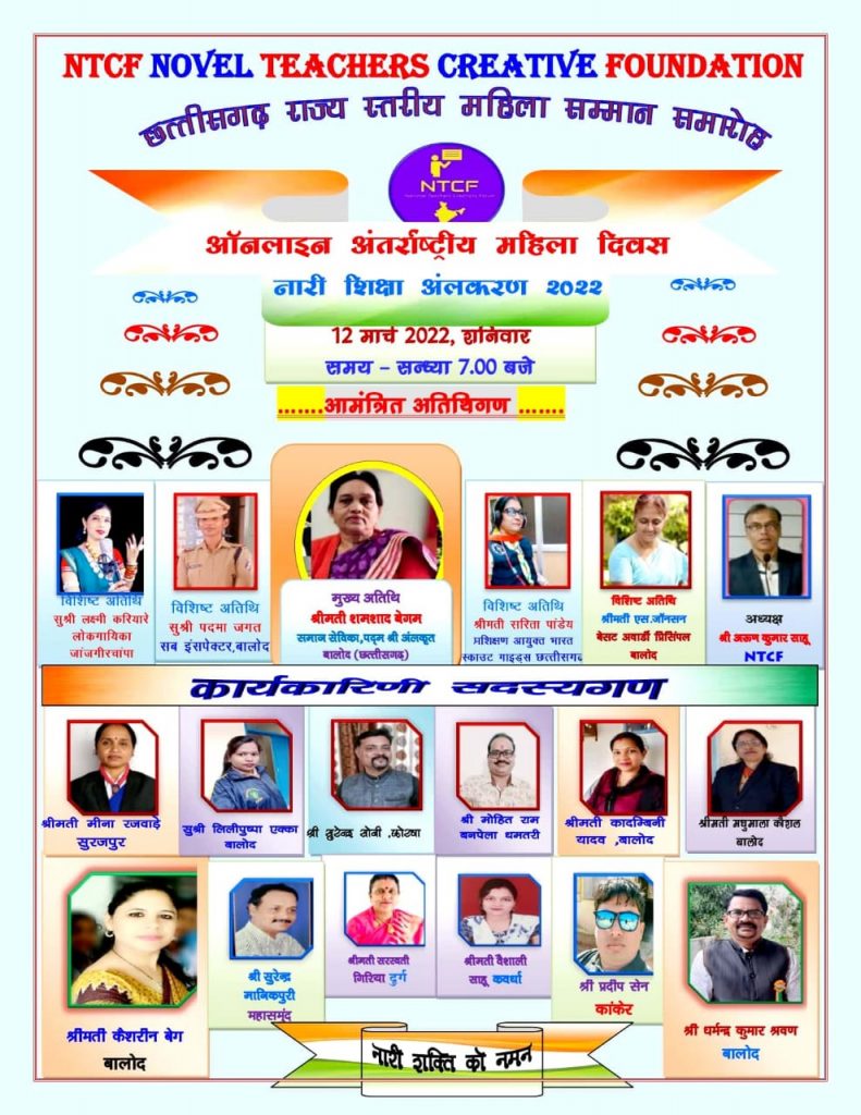 का आयोजन किया गया। जिसमे उस नारी शक्ति का सम्मान किया गया। जो अपने घर के अलावा अपने कार्य क्षेत्रों में बेहतर से बेहतरीन कार्य कर रही है। कार्यक्रम की अध्यक्षता कर रहे एनटीटीएफ के अध्यक्ष अरुण कुमार साहू ने कहा कि नारी धरती की तरह मानवीय सृजन क्षमता एवं संपदा से परिपूर्ण है। शिक्षकों में वैज्ञानिक, सांस्कृतिक, कलात्मक प्रतिभा एवं रचनात्मक कार्यों को अवसर प्रदान करना ही मंच का उद्देश्य है। इस कार्यक्रम के मुख्य अतिथि शमशाद बेगम