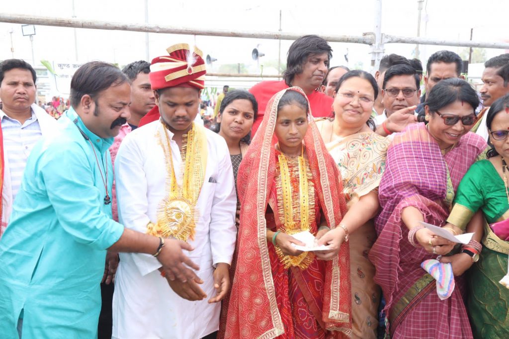 उत्तर बस्तर कांकेर। महिला एवं बाल विकास मंत्री तथा कांकेर जिले के प्रभारी मंत्री श्रीमती अनिला भेड़िया के मुख्य आतिथ्य में अंतागढ़ के उन्मुक्त खेल मैदान में आयोजित मुख्यमंत्री कन्या विवाह योजना अंतर्गत 297 जोड़े परिणय सूत्र में बंधे। नव दंपत्तियों को सुखमय जीवन के लिए अपना आर्शीवाद देते हुए उन्हें कहा कि इस योजना के क्रियान्वयन से कमजोर वर्ग के लोगों को राहत मिली है तथा फिजूल खर्ची रूका है। सामूहिक विवाह में सभी समाज व वर्ग के लोग भागीदारी निभा रहें हैं। उन्होंने बताया कि इस योजना अंतर्गत पहले 15 हजार रूपये का प्रावधान किया गया था, जिसे मुख्यमंत्री भूपेश बघेल द्वारा बढ़ाकर 25 हजार रूपये कर दिया गया है। वर-वधु दोनो दिव्यांग होने पर 01 लाख रूपये की सहायता दी जाती है। इस प्रावधान के लिए उनके द्वारा मुख्यमंत्री श्री भूपेश बघेल के प्रति आभार व्यक्त किया गया।