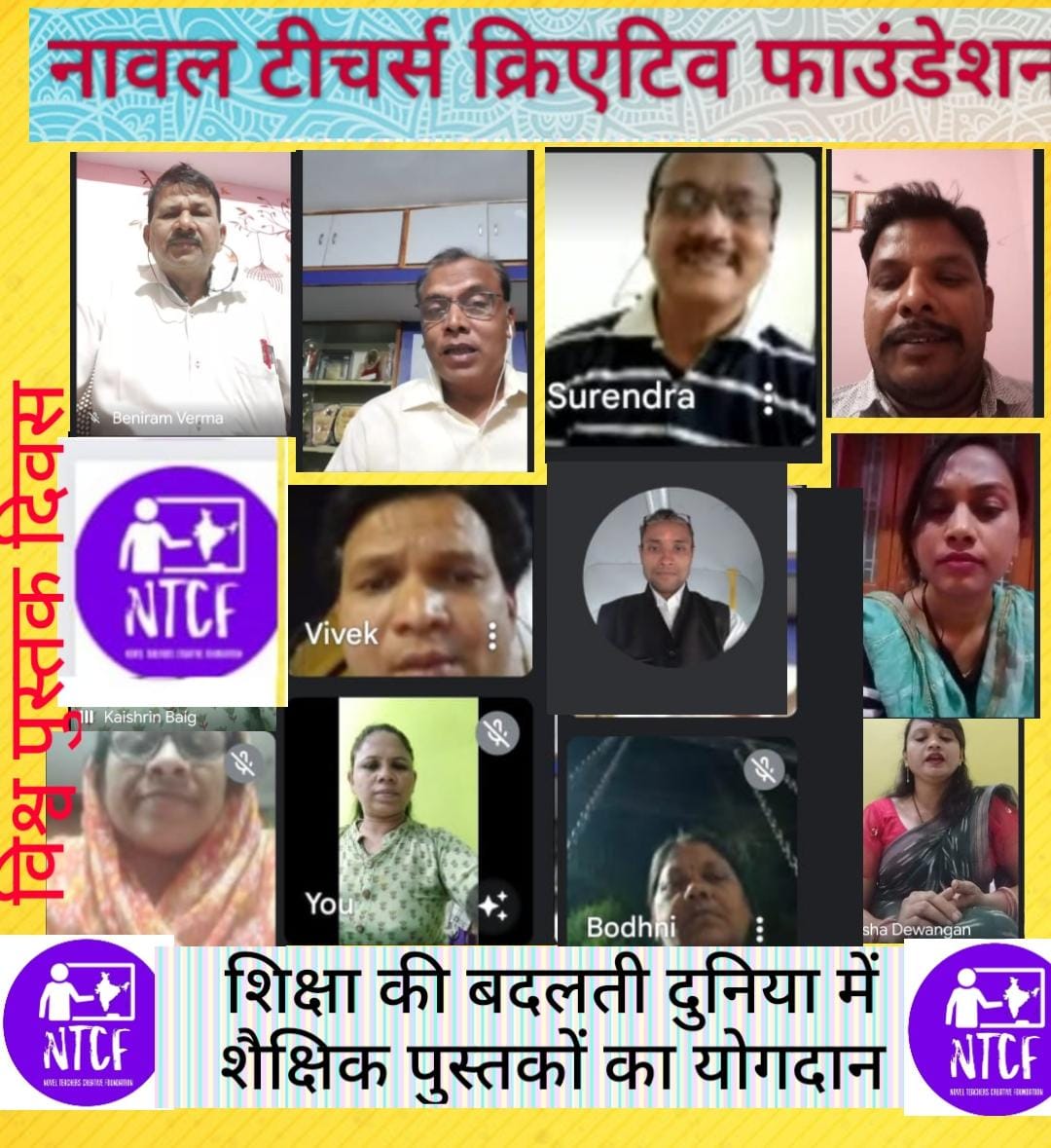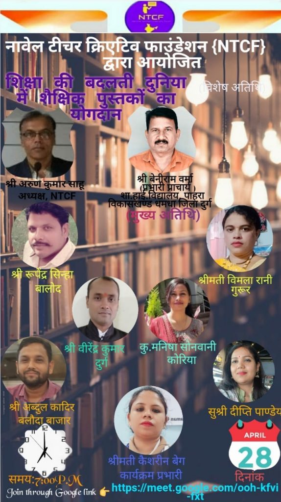 बालोद| नावल टीचर्स क्रिएटिव फाउंडेशन द्वारा विश्व पुस्तक दिवस पर ऑनलाइन वेबीनार आयोजित की गई। इसकी थीम शिक्षा की बदलती दुनिया में शैक्षिक पुस्तकों का योगदान था। विश्व पुस्तक सप्ताह के अंतर्गत पठित शैक्षिक पुस्तकों के समीक्षात्मक अंश प्रस्तुत किया गया। जिसमें मुख्य अतिथि राष्ट्रपति अवॉर्डी बेनीराम वर्मा प्रभारी प्राचार्य शा हाई स्कूल पाहरा विकास खण्ड धमधा जिला दुर्ग थे। अध्यक्षता अरुण कुमार साहू अध्यक्ष एनटीसीएफ ने की। कार्यक्रम प्रभारी श्रीमती कैशरीन बेग थी। संचालन, सुरेंद्र कुमार मानिकपुरी,महासमुंद ने किया।सरस्वती वंदना: कु हिमकल्याणी सिन्हा बेमेतरा,राजगीत,श्रीमती हर्षा देवांगन बालोद ने पेश किया।