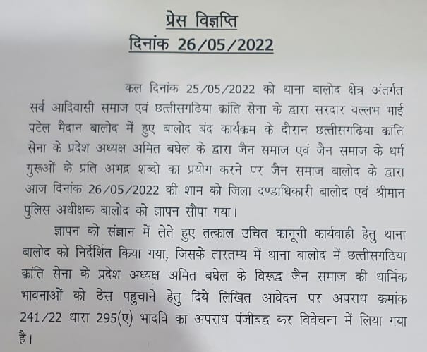 बालोद में भी जैन समाज के लोगों ने कलेक्टर जन्मेजय महोबे को ज्ञापन देकर अभद्र टिप्पणी करने वाले अमित बघेल के खिलाफ कार्रवाई की मांग की। इस दौरान समाज के प्रमुख डॉ प्रदीप जैन, ताराचंद सांखला सहित अन्य मौजूद रहे।