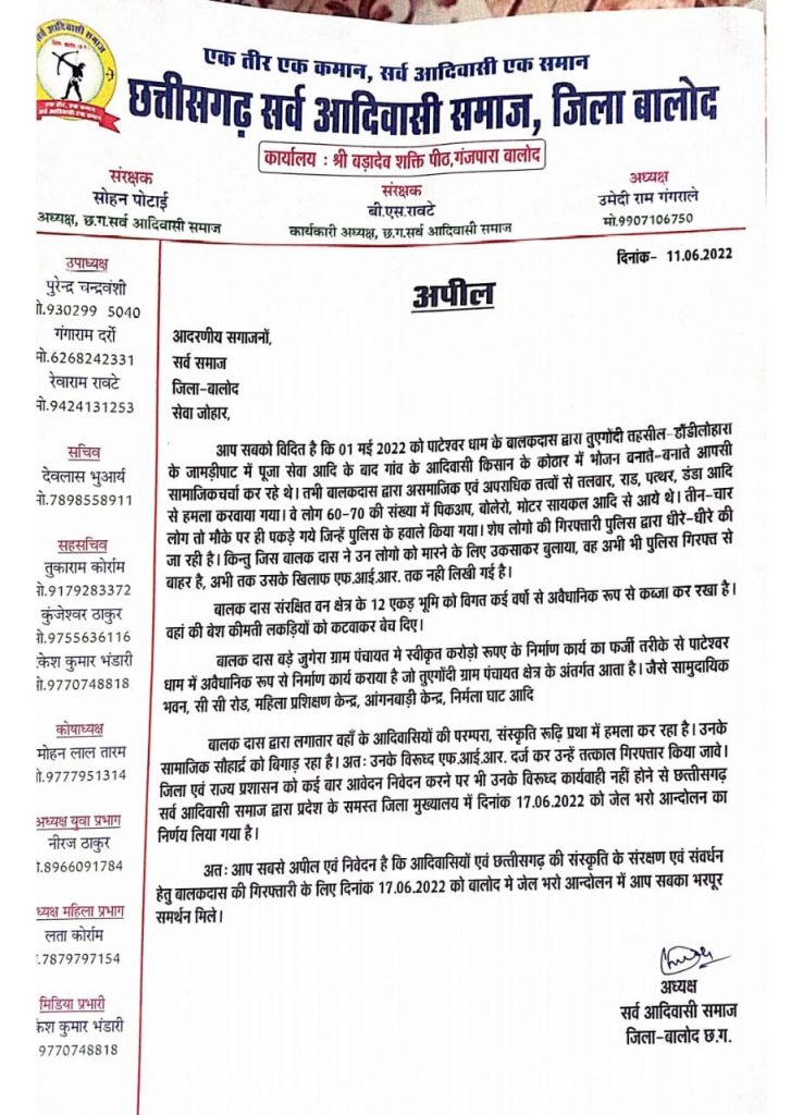 बालोद। पाटेश्वर धाम का मुद्दा अब जिला का नहीं प्रदेश स्तर का मामला बन चुका है। जिसे देखते हुए सर्व आदिवासी समाज तूएगोंदी में हुए आदिवासी लोगों पर हमले के विरोध में हमला करवाने का आरोप पाटेश्वर धाम के महंत बालक दास पर लगाते हुए उसके खिलाफ कार्रवाई की मांग की है।
