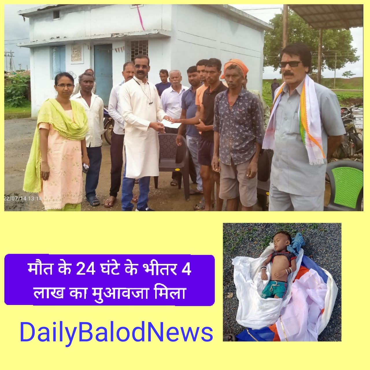 अर्जुंदा में हुए इस हृदय विदारक घटना में डेढ़ साल के बच्चे रियांश यादव की खरखरा नहर में डूबने से मौत में मामले में 24 घंटे के भीतर शासन की योजना के तहत बच्चे के परिजन को 4 लाख रुपए मुआवजा राशि दिलाई गई। संसदीय सचिव व विधायक कुंवर सिंह निषाद की तत्परता से यह संभव हुआ। उन्होंने संबंधित अधिकारियों को तत्काल इस प्रकरण में कार्रवाई के निर्देश दिए। जिसके बाद कलेक्टर ने भी इसे गंभीरता से लिया था और संबंधित अधिकारियों के जरिए मुआवजा प्रकरण स्वीकृत कर 4 लाख रुपए का चेक स्वयं संसदीय सचिव व विधायक ने परिजनों को सौंपा। और इस घटना के लिए दुख व्यक्त करते हुए परिवार को आगे भी यथा संभव मदद करने का आश्वासन दिया। बता दें कि वार्ड क्र. 01 भाटापारा नगर पंचायत अर्जुन्दा जिला बालोद निवासी लेखराम के पुत्र रियांश यादव उम्र डेढ़ वर्ष का अर्जुन्दा नहर नाली पानी में डूबकर 13 जुलाई को मृत्यु हो गई थी। कलेक्टर बालोद डॉ. गौरव कुमार सिंह के द्वारा तत्काल संवेदनशीलता का परिचय देते हुए अनुविभागीय अधिकारी रा. गुण्डरदेही को आर. बी. सी. 6-4 सहायता राशि प्रदान करने के निर्देश दिये गये। कलेक्टर के निर्देशानुसार एस.डी.एम. प्रेमलता चंदेल के मार्गदर्शन में तहसीलदार अर्जुन्दा ममता टावरी के द्वारा आर.बी.सी. 6-4 के तहत प्रकरण दर्ज कर तत्काल 24 घंटे के भीतर कुंवर सिंह निषाद विधायक गुण्डरदेही एवं संसदीय सचिव छ.ग. शासन के हाथों मृतक रियांश यादव के पिता लेखराम को 4 लाख रुपए आर्थिक सहायता राशि का चेक प्रदान किया गया।