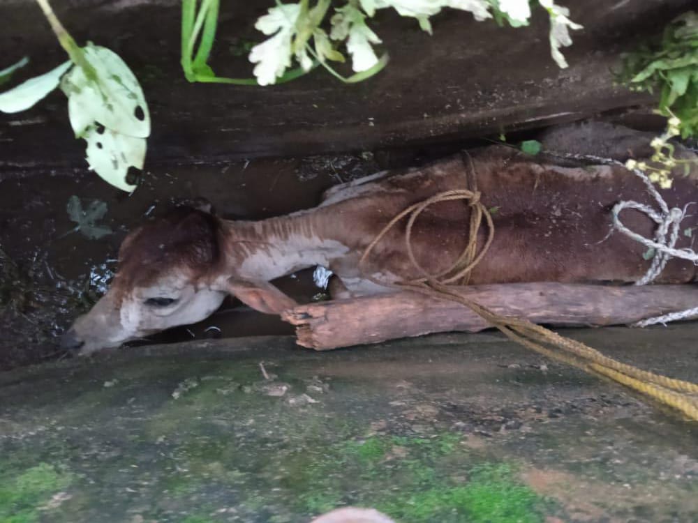 बालोद। यह तस्वीर ग्राम चौरेल की है। जहां पर पुराने नाली जो कि करीब 6 फीट गहरी है,में एक बछिया फंस गई थी। जिसे निकालना बहुत मुश्किल था। ग्रामीणों ने अपने स्तर पर प्रयास किया। लेकिन निकाल नहीं पाए थे। घटना की सूचना मिलने के बाद पशु चिकित्सा विभाग से