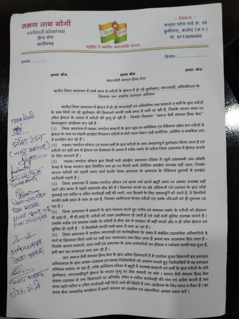 बालोद| हिंद सेना के राष्ट्रीय अध्यक्ष मंगेश वैध साहू के निर्देशानुसार समाज सेवी संगठन हिंद सेना के द्वारा जिला अस्पताल बालोद में हो रही विभिन्न अनियमितता के लिए चलाए जा रहे हल्ला बोल जनाक्रोश हस्ताक्षर अभियान के तीसरे दिन आज हिंद सेना की टीम कार्यकारिणी प्रदेश अध्यक्ष तरुण नाथ योगी के नेतृत्व में किसान मोर्चा जिला अध्यक्ष संतोष चंद्राकर और जिला उपाध्यक्ष भूपत हटिले जिला महामंत्री विजय हरदेल एवं अन्य सैनिकों के साथ ग्राम पंचायत जुंगेरा,ग्राम कोहंगाटोला, ग्राम पंचायत मनौद, ग्राम पंचायत तरौद के सरपंच और ग्राम वासियों के हस्ताक्षर के लिए पहुंची जहां लोगों में जिला अस्पताल के खिलाफ आक्रोश देखा गया और सभी ने कहा कि हम इस लड़ाई में हिन्द सेना के साथ जिला अस्पताल बालोद के खिलाफ मिलकर कार्य करेंगे