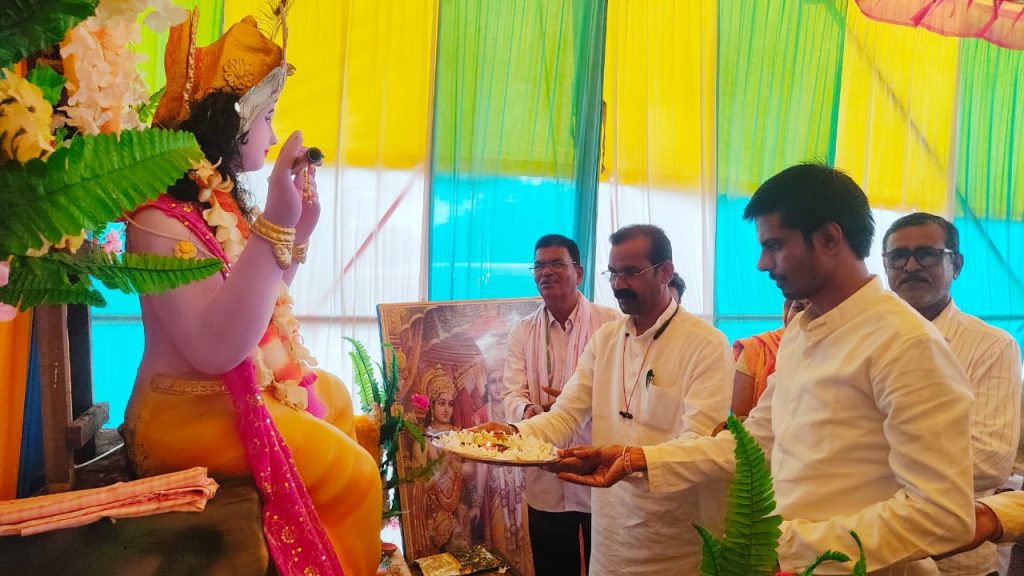देवरीबंगला/बालोद | संसदीय सचिव व विधायक कुंवरसिंह निषाद ग्राम मनकी में राधा कृष्ण मंदिर के मूर्ति स्थापना तथा जन्माष्टमी पर्व कार्यक्रम में शामिल हुए। मंदिर में मूर्ति के प्राण प्रतिष्ठा कार्यक्रम में राघोनवागांव, मनकी, साल्हे , गणेश खपरी, कुआंगांव के यादव समाज के लोग शामिल हुए। समाज की महिलाओं ने भव्य कलश यात्रा निकालकर अतिथियों का स्वागत किया। संसदीय सचिव ने कहा कि भगवान श्री कृष्ण स्वयं हंसे लेकिन गोपियों को रुलाया। वे रणछोड़ कहलाए।