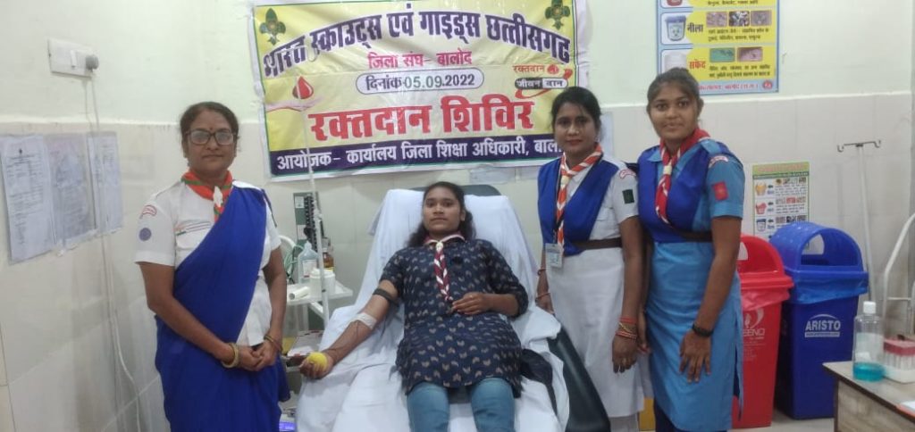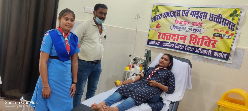 बालोद। भारत स्काउट गाइड छत्तीसगढ़ राज्य मुख्यालय रायपुर के पत्र एवं राज्य मुख्य आयुक्त विनोद सेवन लाल चंद्राकर संसदीय सचिव विधायक महासमुंद एवं राज्य सचिव कैलाश सोनी के मार्गदर्शन तथा भारत स्काउट एवं गाइड जिला संघ बालोद के जिला मुख्य आयुक्त गिरीश चंद्राकर, जिला संघ अध्यक्ष सुभाष पुसतकर, जिला शिक्षा अधिकारी बालोद पदेन जिला आयुक्त प्रवास कुमार बघेल, राज्य संयुक्त सचिव सीमा साहू जिला प्रशिक्षण आयुक्त भुवन सिन्हा, जिला सचिव अरविंद सोनी, मिलन सिन्हा कोषाध्यक्ष, धनेश्वरी सोनवानी डीओसी गाइड, प्रेमलता चन्द्राकर सहा. डीओसी एवं पांचों विकासखंड के सचिव एवं संयुक्त सचिव के निर्देशन में शिक्षक दिवस के उपलक्ष्य में रक्तदान शिविर जिला चिकित्सालय बालोद में कार्यालय जिला शिक्षा अधिकारी बालोद द्वारा आयोजित किया गया।