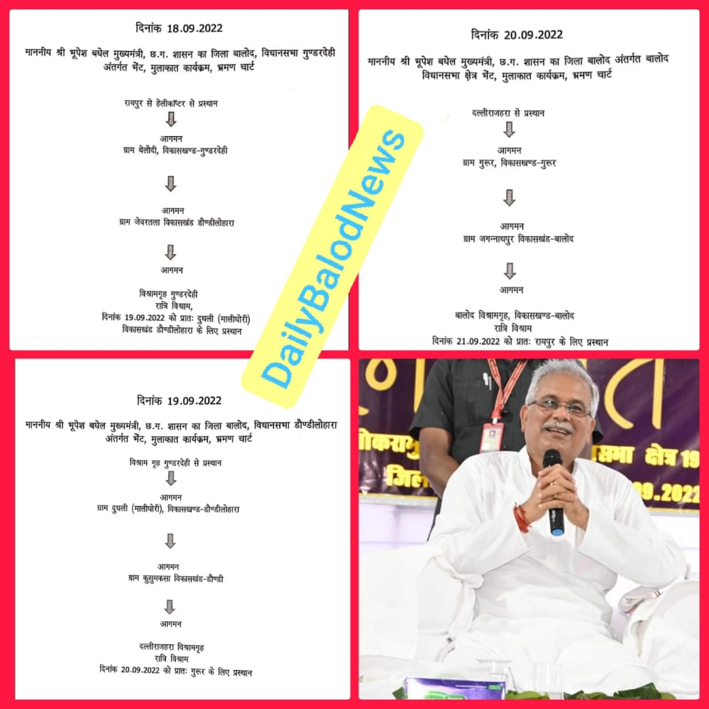 बालोद। अंततः बालोद जिले में होने वाले भेंट मुलाकात को लेकर मुख्यमंत्री भूपेश बघेल का रूट चार्ट जारी कर दिया गया है। इससे अब असमंजस व इंतजार की बातें खत्म हो जाएगी और पुख्ता हो गई है कि मुख्यमंत्री बालोद जिले में कहां-कहां और कब आएंगे। हम आपको इसकी विस्तृत जानकारी सर्वप्रथम दे रहे हैं। मुख्यमंत्री बालोद जिले में 18 से 20 सितंबर तक रहेंगे। 18 सितंबर को रायपुर से हेलीकॉप्टर से प्रस्थान कर सबसे पहले उनका आगमन गुंडरदेही विकासखंड के ग्राम बेलौदी में होगा। इसके बाद वे डौंडीलोहारा ब्लॉक के जेवरतला पहुंचेंगे। फिर उनका रात्रि विश्राम गुंडरदेही के रेस्ट हाउस में होगा। फिर वे 19 सितंबर को गुंडरदेही से प्रस्थान कर दूधली मालीघोरी (डौंडी लोहारा ब्लॉक) पहुंचेंगे। यहां से कुसुमकसा में जाएंगे। फिर दल्लीराजहरा विश्राम गृह में रात रुकेंगे। अगले दिन 20 सितंबर को वे दल्ली राजहरा से प्रस्थान कर गुरुर पहुंचेंगे। फिर वहां से जगन्नाथपुर (विकासखंड बालोद) आएंगे। फिर रात्रि में बालोद के विश्राम गृह में रुक कर 21 सितंबर को सुबह रायपुर के लिए प्रस्थान करेंगे। पहले से ही उनके प्रस्तावित जगहों पर शासन प्रशासन उनके आगमन को लेकर तैयारियों में जुटा हुआ है। अब रूट (फॉलो) चार्ट जारी होने के बाद तैयारी में और तेजी देखने को मिलेगी।