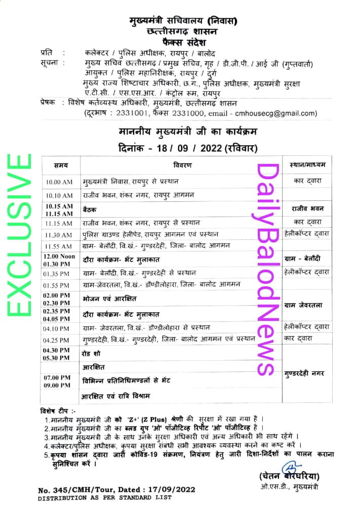 बालोद। मुख्यमंत्री का बालोद जिले में भेंट मुलाकात का कार्यक्रम रविवार 18 सितंबर से शुरू हो रहा है। फिलहाल पहले दिन को लेकर प्रोटोकाल जारी हो चुका है। तीनों दिन का कार्यक्रम बालोद जिले में है। 1 दिन पहले से आने वाले दिन के कार्यक्रम का प्रोटोकॉल जारी किया जा रहा है। शनिवार रात 9 बजे के करीब पहले दिन 18 सितंबर के कार्यक्रम को लेकर प्रोटोकॉल पर जारी किया गया है। मुख्यमंत्री श्री भूपेश बघेल के भेंट-मुलाकात अभियान के तहत 18 से 21 सितंबर तक बालोद जिले के दौरे पर रहेंगे। मुख्यमंत्री 18 सितंबर को बालोद जिले के विधानसभा क्षेत्र गुण्डरदेही, 19 सितंबर को डौण्डीलोहारा एवं 20 सितंबर को संजारी बालोद विधानसभा क्षेत्र में आम जनता से सीधे रू-ब-रू होंगे। मुख्यमंत्री तीनों विधानसभा क्षेत्रों के विभिन्न गांवों में लोगों से भेंट-मुलाकात करने के साथ ही शासकीय योजनाओं एवं कार्यक्रमों के क्रियान्वयन की स्थिति का जायजा और फीडबैक लेंगे। मुख्यमंत्री श्री बघेल इस दौरान विभिन्न समाज एवं संगठनों के पदाधिकारियों से भेंट-मुलाकात, मीडिया प्रतिनिधियों से चर्चा तथा विकास एवं निर्माण कार्यों का लोकार्पण एवं भूमिपूजन रात्रि विश्राम भी करेंगे। मुख्यमंत्री 21 सितंबर को बालोद से रायपुर लौट आयेंगे।