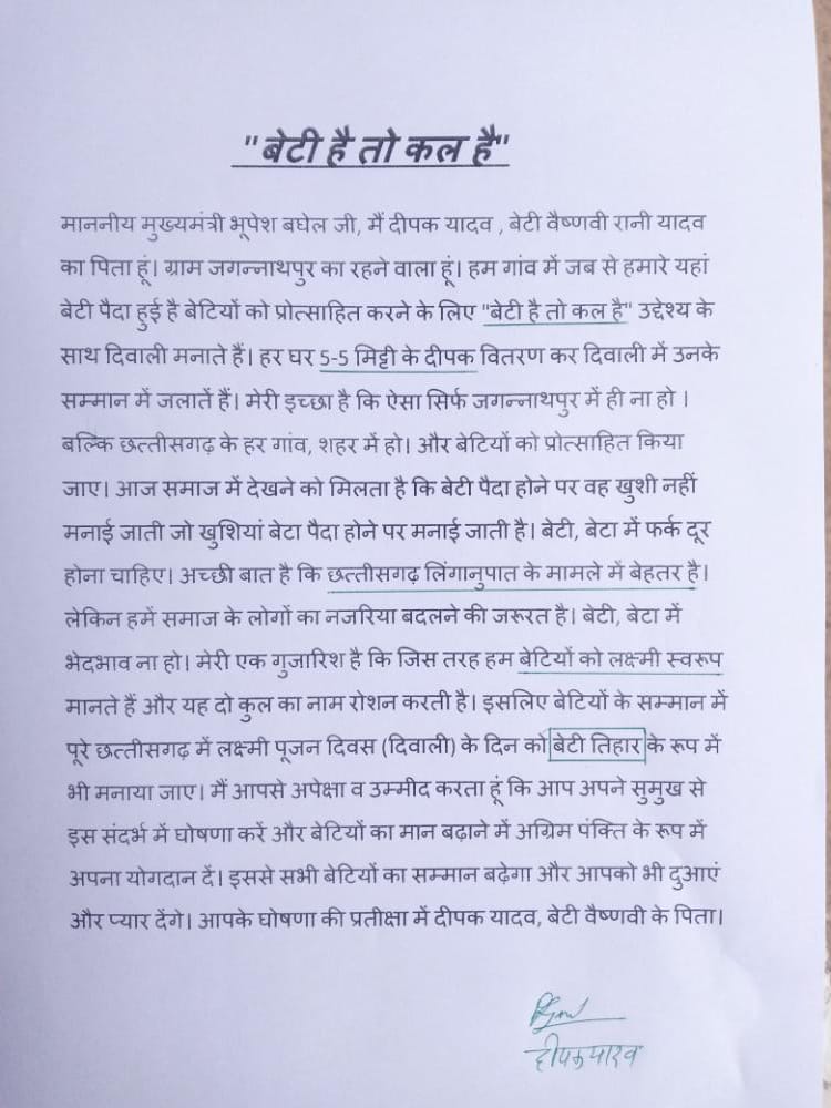 इस दौरान पिता दीपक ने मुख्यमंत्री को बेटी वैष्णवी की ओर से एक फोटो फ्रेम भेंट किया जिसमें “पहुना ल मया के पाती” के साथ कका के लिए छत्तीसगढ़ी में शायरी लिखा था। इसके अलावा उन्होंने एक पत्र भी दिया जिसमें बेटी है तो कल है के उद्देश्य को बतलाया गया था। उन्होंने इस पत्र के जरिए मुख्यमंत्री से अपेक्षा भी की कि दिवाली पर लक्ष्मी पूजन दिवस पर बेटी तिहार के रूप में भी मनाया जाना चाहिए।