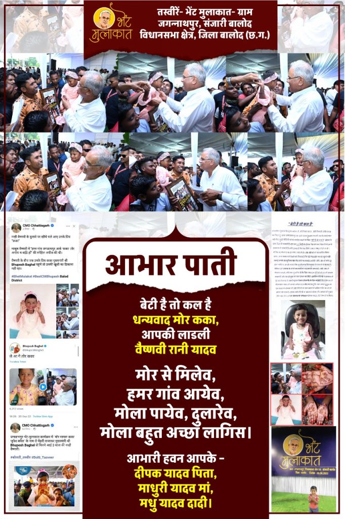 इस पाती में बेटी है तो कल है का संदेश देते हुए मुख्यमंत्री के फेसबुक, ट्विटर और सीएमओ के फेसबुक पेज, अकाउंट पर बेटी वैष्णवी से संबंधित डाले गए पोस्ट के स्क्रीनशॉट और बच्ची की कका से पहली मुलाकात की तस्वीरें शामिल किए गए थे । तो साथ ही छत्तीसगढ़ी में वैष्णवी की ओर से लिखा गया था ” धन्यवाद मोर कका, आप की लाडली वैष्णवी रानी. मोर से मिलेव,हमर गांव आयेव, मोला पायेव, दुलारेव, मोला बहुत अच्छा लागिस। आभार पाती भेंट करने के दौरान विधायक संगीता सिन्हा, नगर पालिका अध्यक्ष विकास चोपड़ा, संसदीय सचिव कुंवर निषाद, जिला कांग्रेस कमेटी के अध्यक्ष चंद्रप्रभा सुधाकर सहित अन्य मौजूद रहे।