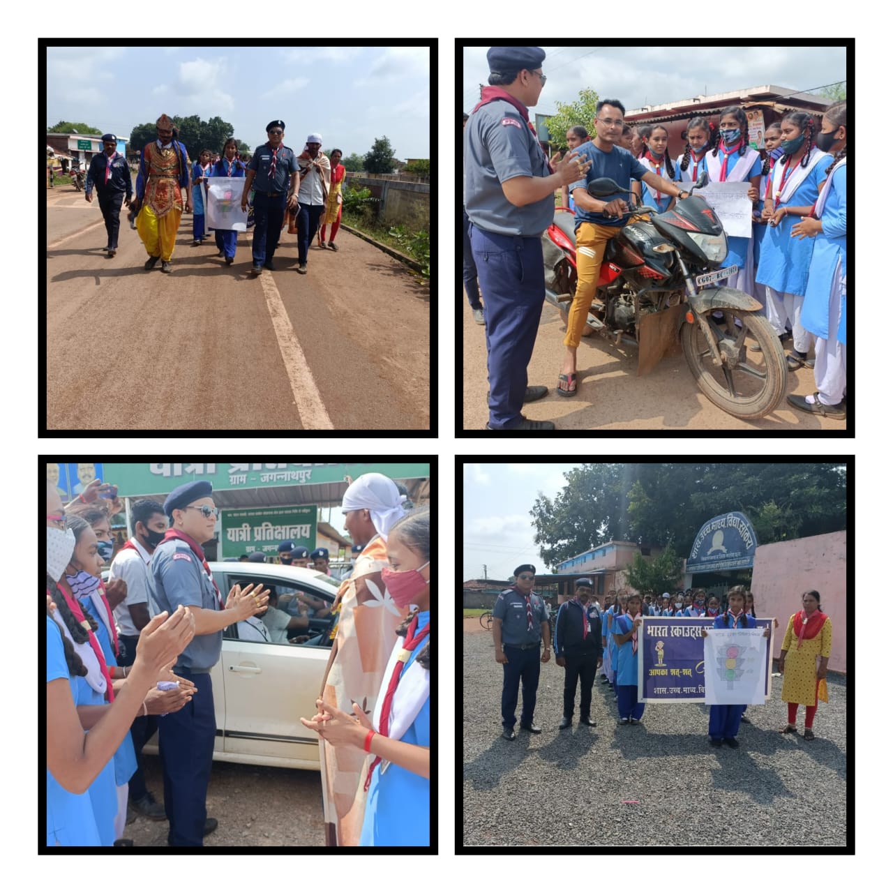 यमराज व चित्रगुप्त के वेश में पहुंचे इन बच्चों ने बिना हेलमेट, बिना सीट बेल्ट के चल रहे वाहन चालकों से फिल्मी अंदाज में कहा- कृपया हेलमेट पहना करें, वरना किसी दिन उठा ले जाएंगे। बच्चों ने वाहन चालकों से यातायात के नियमों का पालन करने की अपील भी की।स्काऊट/गाइड/रोवर/रेंजर ने उक्त सड़क सुरक्षा जागरूकता अभियान चलाया व सभी नागरिकों को सड़क सुरक्षा के प्रति जागरूक किया गया।जिला मुख्य आयुक्त गिरीश चंद्राकर तथा अध्यक्ष सुभाष पुस्तकर ,राज्य संयुक्त सचिव सीमा साहू,जिला सचिव अरविंद सोनीके मार्गदर्शन , डीओसी अवधेश विश्वकर्मा, एडीओसी प्रेमलता चंद्राकर,विकासखंड सचिव रूपेंद्र सिन्हा के मार्गदर्शन में ये आयोजन हुआ। जिसमें प्रभारी रोवर स्काऊट लीडर विवेक धुर्वे, टीआर ठाकुर, आईएल लेंडिया, दुर्गा सिन्हा ने प्रभारी की भूमिका निभाई व सभी स्काऊट के बच्चे दिगम्बर, सुमन,मुकेश,त्रिभुवन, लकेश्वर,नेहा,साक्षी,मुरलीधर,