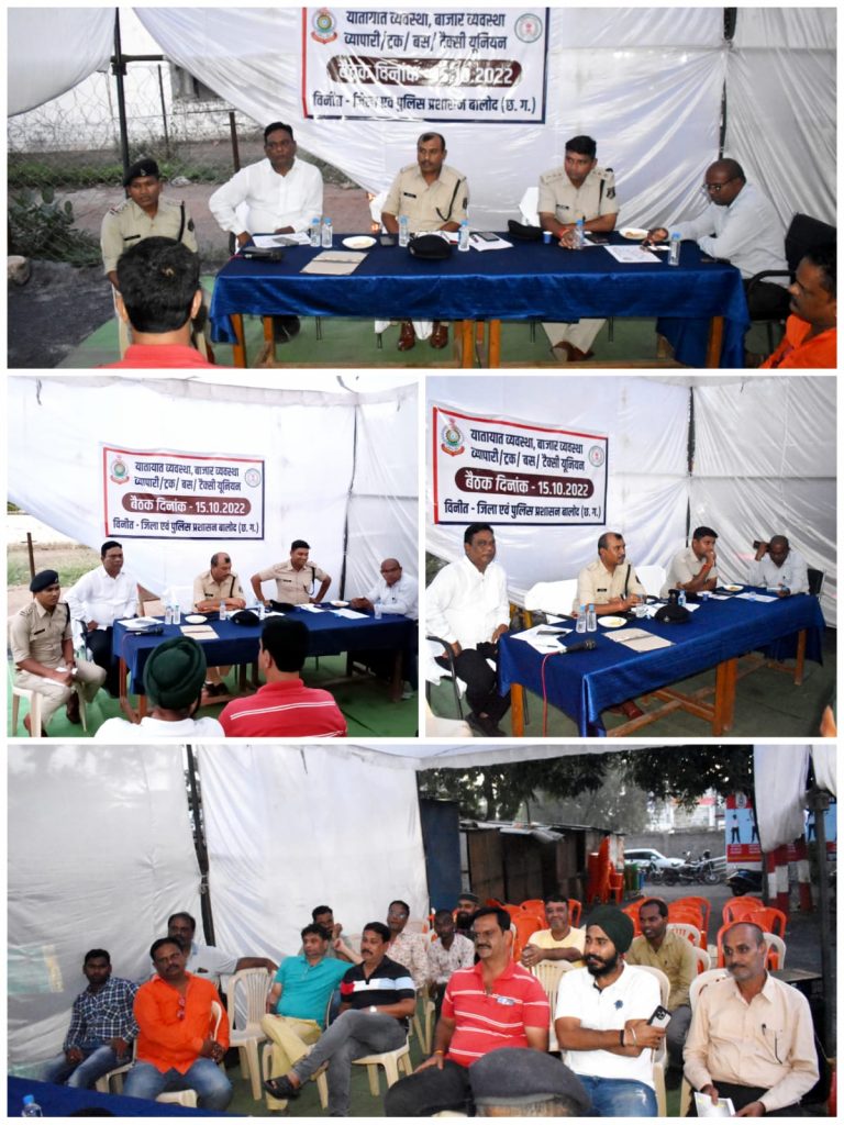 इस दौरान 20 से 26 अक्टूबर तक बालोद शहर के व्यस्त मार्ग जैसे घड़ी चौक से सदर बाजार, बुधवारी बाजार एवं मधुचौक में मालवाहक वाहनों के प्रवेश को समय प्रातः 09.00 बजे से रात्रि 11.00 बजे तक निषेध किया गया है। तथा शहर के 06 स्थानों सी मार्ट, सरदार पटेल मैदान, न्यायालय परिसर के सामने, महावीर स्कूल, बाल मंदिर स्कूल, कन्या शाला स्कूल में दोपहिया एवं चारपहिया वाहनों की पार्किंंग के रूप में चिन्हांकित किया गया है। इस बैठक के दौरान व्यापारियों को 20 अक्टूबर से रात्रि 10.00 बजे के बाद एवं प्रातः 09.00 बजे के पूर्व तक सदर बाजार क्षेत्र में मालवाहक वाहनो से समानो के लोडिंग अनलोडिंग करने हेतु निर्देशित किया गया है। व्यापारियों से अनुरोध किया गया कि अपने दुकानों के सामने चारपहिया वाहनों की पार्किंग न करने दे एवं दुकानों में सीसीटीवी कैमरा अवश्य लगावे। साथ ही एक कैमरा का फोकस रोड़ की ओर रखें ताकि किसी भी प्रकार की घटना दुर्घटना होने की स्थिति में सहयोग मिल सकें। जिला एवं पुलिस प्रशासन बालोद ने आम नागरिकों से अपील की है कि निर्धारित पार्किंग स्थलों में ही अपने वाहनों की पार्किंग किया जाए एवं व्यपारियों/दुकानदारो के द्वारा अपने दुकानो, व्यवसाय के सामने अनाधिकृत रूप से सामान फैलाकर व्यवसाय नहीं करें। व्यापारियों/दुकानदारो को अपने दुकानो के सामने पार्किंग के लिए पर्याप्त जगह रखने की हिदायत दी गई। बैठक में बालोद चेंबर ऑफ कॉमर्स के अध्यक्ष राजू भाई पटेल, सचिव संजोग टावरी कोषाध्यक्ष सुनील रतन बोहरा, संरक्षक दीपचंद जैन, हरीश सांखला एवं सदस्य गण विक्रम लालवानी धीरज पटेल ट्रक परिवहन संघ के अध्यक्ष राजा चौहान एवं व्यापारीगण उपस्थित रहें।