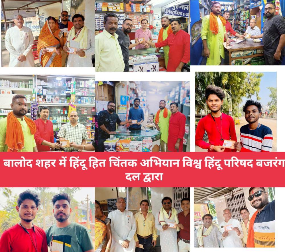 बालोद। शहर में हित चिंतक अभियान चलाया जा रहा है। विश्व हिंदू परिषद, बजरंग दल द्वारा इस अभियान के तहत सभी हिंदू भाई बहन और सभी सनातनीयो से संपर्क किया जा रहा है। अभियान का एकमात्र लक्ष्य सभी हिंदुओं को एक करना और बालोद शहर और जिले में जो लगातार धर्मांतरण का जो खेल चल रहा है उसमें लगाम कसना। विश्व हिंदू परिषद बजरंग दल का एकमात्र लक्ष्य होगा और विश्व हिंदू परिषद बजरंग दल का सभी हिंदू सनातनी बहनों से एक निवेदन किया है कि किसी भी से फ्रेंडशिप दोस्ती करने से पहले उसका पूरा डिटेल जान ले। फिर दोस्ती आगे बढ़ाएं। ऐसी कई घटनाएं घट चुकी है जिसमें प्यार के चलते कई हिंदु बहनों ने अपनी जान गंवा चुकी है। इन दिनों सामने आ रही घटनाओं से यह भी साफ हो रहा है कि हिंदू लड़कियों को कुछ विशेष समुदाय द्वारा टारगेट किया जा रहा है। इस अभियान के जरिए शासन से भी यह अपील की जा रही है कि धर्म परिवर्तन करने वालों को जाति विशेष आरक्षण का लाभ ना दिया जाए।