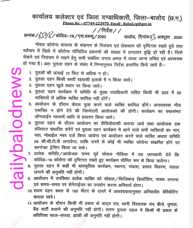 बालोद। जिला कलेक्टर व दंडाधिकारी जन्मेजय महोबे ने जिले में दशहरे के आयोजन को लेकर निर्देश जारी कर दिया है। इस बार दशहरे पर भी कोरोना का साया रहेगा। जिसको लेकर सावधानी बरतने के लिए आदेश जारी किया गया है। इस दशहरे में 22 तरह के नियमों का पालन करते करने पर ही दशहरा मनाने की अनुमति मिलेगी। आदेश में कहा गया है कि रावण के पुतलों की ऊंचाई 10 फीट से अधिक नहीं होनी चाहिए। पुतला दहन खुले स्थान पर किया जाएगा। पुतला दहन कार्यक्रम में समिति के मुख्य पदाधिकारी सहित किसी भी हाल में 50 से अधिक व्यक्ति शामिल नहीं होंगे। आयोजन के दौरान आयोजन की वीडियोग्राफी कराई जाएगी। एक रजिस्टर संधारित करेंगे। वह पुतला दहन कार्यक्रम में आने वाले सभी व्यक्तियों का नाम पता मोबाइल नंबर दर्ज किया जाएगा। आयोजन करने वाले व्यक्ति अथवा समिति 4 सीसीटीवी कैमरा लगाएंगे। ताकि कोई भी व्यक्ति कोरोना पॉजिटिव पाया जाता है तो कांटेक्ट ट्रेसिंग किया जा सके और भी कई नियम लागू किए गए हैं। जिन्हें आप इस आदेश में पढ़ सकते हैं।