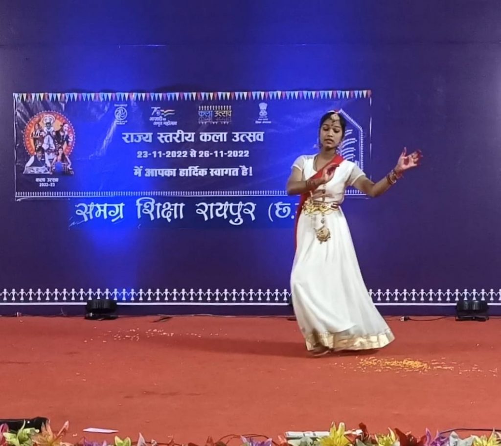 उन्होंने अपने नृत्य में नंदगांव के नटखट गोपाल का राधारानी और गोपियों के साथ बरसाना होली खेलने तथा राधा और उनकी सखियां ,कृष्ण और उनके शाखाओं से परेशान होकर उन्हें सबक सिखाने के लिए प्यार से उन पर लाठियां बरसाया करती थी। उनके यह प्रेम पूर्वक होली खेलने की अनोखा परंपरा को नृत्य के माध्यम से प्रस्तुत कर दर्शकों और निर्णयको को अपनी कला के प्रति आकर्षित कर दिया।नैना की कथक नृत्य प्रस्तुति को खूब सराहा गया। आधुनिकता के इस दौर में गांव की पगडंडियों से निकलकर राज्य में परचम लहराते हुए अपने कला से कुसुमकसा का नाम रोशन करने पर प्राचार्य तृनाभ मिश्रा ने हर्ष व्यक्त करते हुए आशीर्वाद देकर उज्जवल भविष्य की कामना की। और कहा प्रदेश में अनेक आयोजन होते हैं। लेकिन कला और संस्कृति को सहेजने के लिए जो दृढ़ संकल्प इस आयोजन में दिखता है। वह और कहीं नहीं दिखता। यह आयोजन प्रतिभावान कलाकारों के लिए एक बड़ा अवसर उपलब्ध करा रहा है। व्याख्याता तामसिंग पारकर ने बताया कि स्कूल शिक्षा और साक्षरता विभाग शिक्षा मंत्रालय भारत सरकार माध्यमिक स्तर के विद्यार्थियों की कलात्मक प्रतिभा को पहचानने उसे पोषित करने और शिक्षा में कला को बढ़ावा देने के उद्देश्य से कला उत्सव का आयोजन फेस टू फेस में किया गया । कला उत्सव 2022 पारंपरिक लोक कलाओं और शास्त्रीय कलाओ की विभिन्न शैलियों पर केंद्रित है।यह स्कूलों में उत्सव की वह पहल है जो प्रत्येक वर्ष आयोजित हो रही है। नैना सिंह की इस उपलब्धि पर शाला प्रबंधन समिति के अध्यक्ष अनिल सुथार, ग्राम सरपंच शिवराम सिंदरामें, नितिन जैन, जनपद सदस्य संजय बेस , वाजिद खान,शाला के व्याख्याता सुनीता यादव ,उमा त्रिपाठी ,मर्सी जॉर्ज , गीता गुप्ता, अशोक कुमार सिन्हा, राजेंद्र कुमार आवाडे, इंद्राणी मुखर्जी ,चंपू राम सुधाकर ,प्रतिभा सिंह ,कृतिका साहू ,आशा प्रधान ,दीपमाला जोशी ,रंजना खोबरागडे ,सावित्री स्वर्णकार ,व्यायाम अनुदेशक लक्ष्मण गुरुंग, किरण झा ,देहुती कोठारी, डॉली मेश्राम,बीएल नायक ,सीबी डाहरे विजयलक्ष्मी साहू तथा समस्त ग्राम वासियों ने खुशी जाहिर करते हुए उज्जवल भविष्य की कामना की।