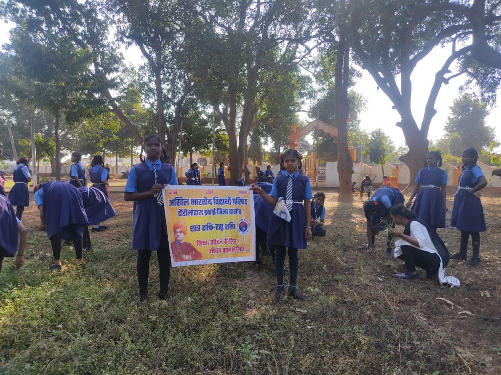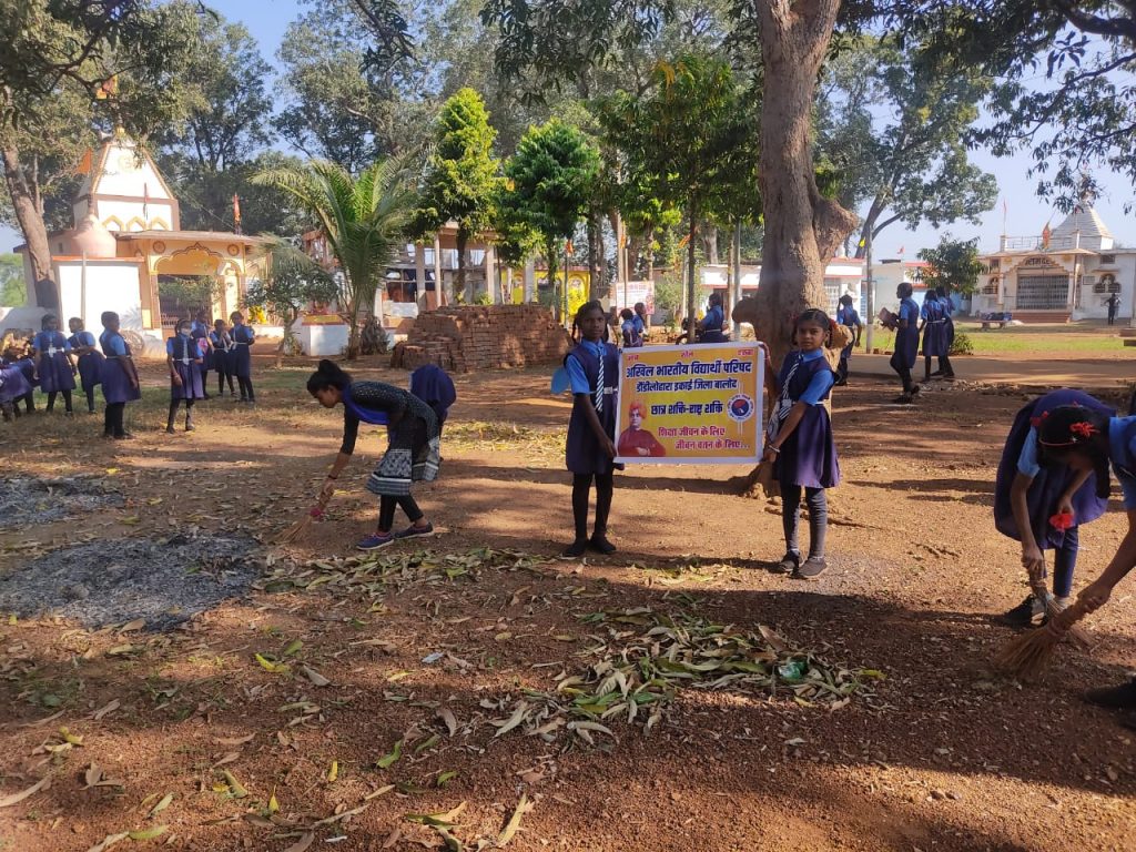 शासकीय माध्यमिक विद्यालय के स्कूली छात्र छात्राओं के साथ मिलकर एबीवीपी के सदस्यों द्वारा मंदिर परिसर की साफ सफाई की और